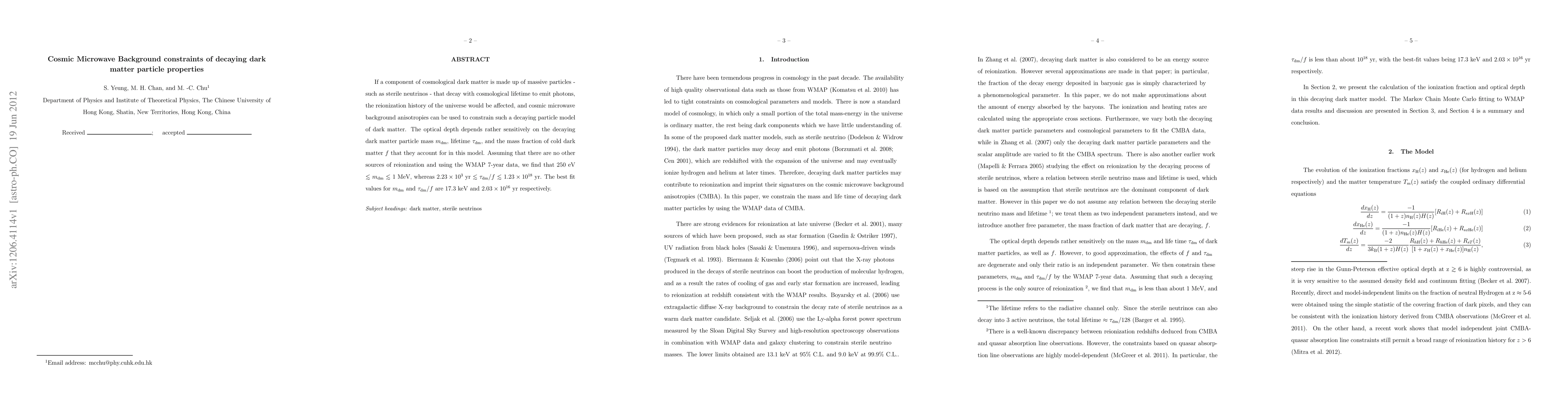 This paper investigates the impact of decaying dark matter particles, such as sterile neutrinos, on the cosmic microwave background (CMB) and constrains their properties using WMAP 7-year data. The study finds that the mass of these particles lies between 250 eV and 1 MeV, and their lifetime ranges from 2.23*10^3 years to 1.23*10^18 years.