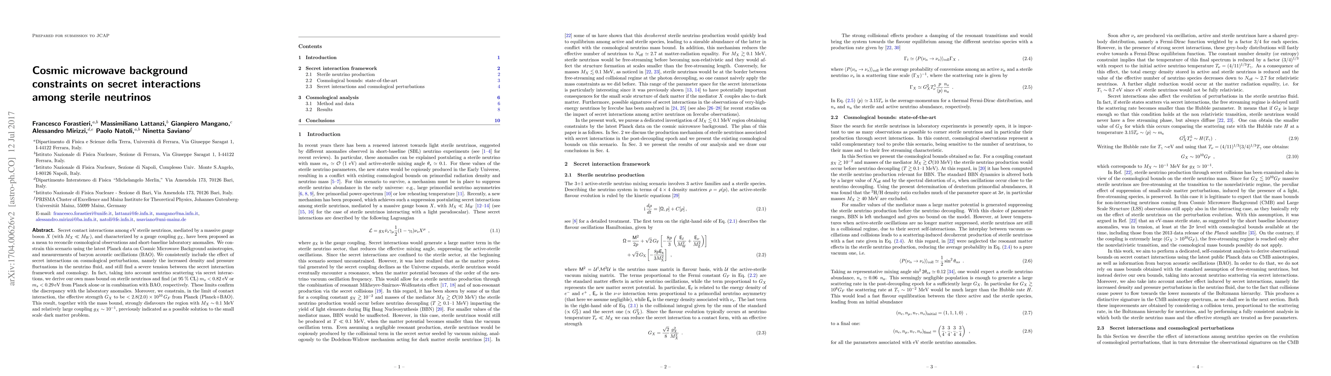 Secret contact interactions among eV sterile neutrinos, mediated by a massive gauge boson $X$ (with $M_X \ll M_W$), and characterized by a gauge coupling $g_X$, have been proposed as a mean to reconcile cosmological observations and short-baseline laboratory anomalies. We constrain this scenario using the latest Planck data on Cosmic Microwave Background anisotropies, and measurements of baryon acoustic oscillations (BAO). We consistently include the effect of secret interactions on cosmological perturbations, namely the increased density and pressure fluctuations in the neutrino fluid, and still find a severe tension between the secret interaction framework and cosmology. In fact, taking into account neutrino scattering via secret interactions, we derive our own mass bound on sterile neutrinos and find (at 95% CL) $m_s < 0.82$ eV or $m_s < 0.29$ eV from Planck alone or in combination with BAO, respectively. These limits confirm the discrepancy with the laboratory anomalies. Moreover, we constrain, in the limit of contact interaction, the effective strength $G_X$ to be $ < 2.8 (2.0) \times 10^{10}\,G_F$ from Planck (Planck+BAO). This result, together with the mass bound, strongly disfavours the region with $M_X \sim 0.1$ MeV and relatively large coupling $g_X\sim 10^{-1}$, previously indicated as a possible solution to the small scale dark matter problem.