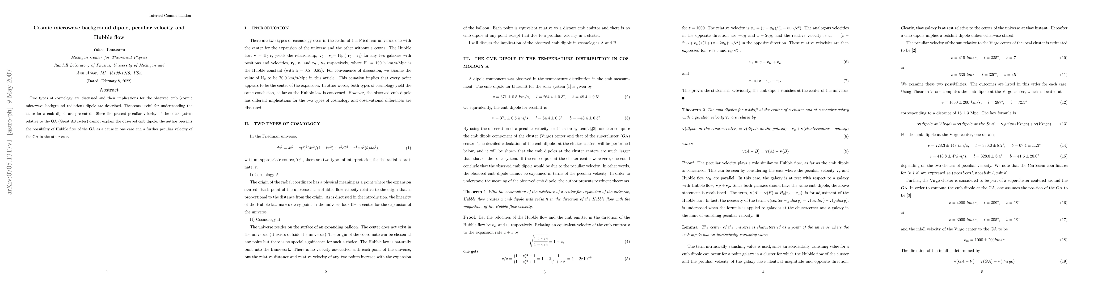 Two types of cosmology are discussed and their implications for the observed cmb (cosmic microwave background radiation) dipole are described. Theorems useful for understanding the cause for a cmb dipole are presented. Since the present peculiar velocity of the solar system relative to the GA (Great Attracter) cannot explain the observed cmb dipole, the author presents the possibility of Hubble flow of the GA as a cause in one case and a further peculiar velocity of the GA in the other case.