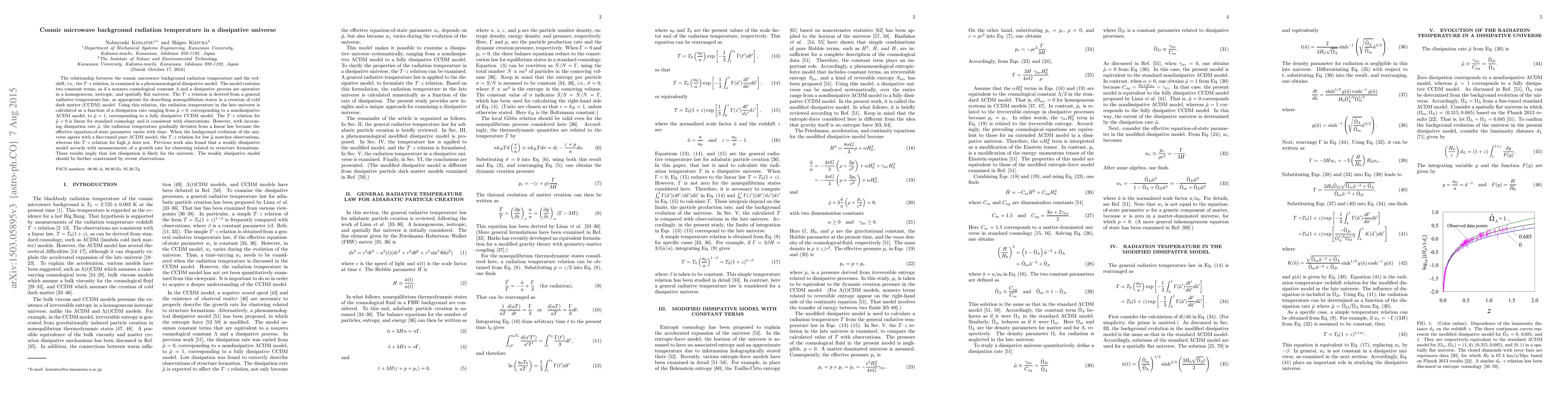 This paper examines the $T$--$z$ relation in a dissipative model of the universe, finding that low dissipation rates align with observations, while higher rates deviate, suggesting low dissipation is likely. The model incorporates a cosmological constant and a dissipative process, with implications for the cosmic microwave background radiation temperature.