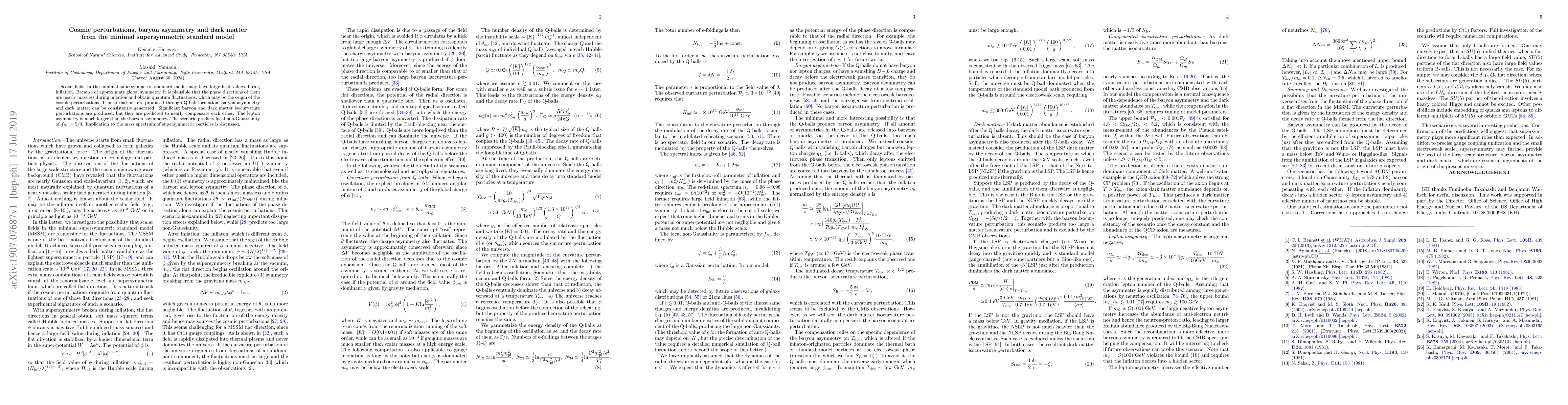 This paper explores how scalar fields in the minimal supersymmetric standard model during inflation could generate cosmic perturbations, baryon asymmetry, and dark matter through Q-ball formation. It predicts significant but compensating baryon and dark matter isocurvature perturbations, a larger lepton asymmetry than baryon asymmetry, and local non-Gaussianity with $f_{\rm NL} = 5/3$.