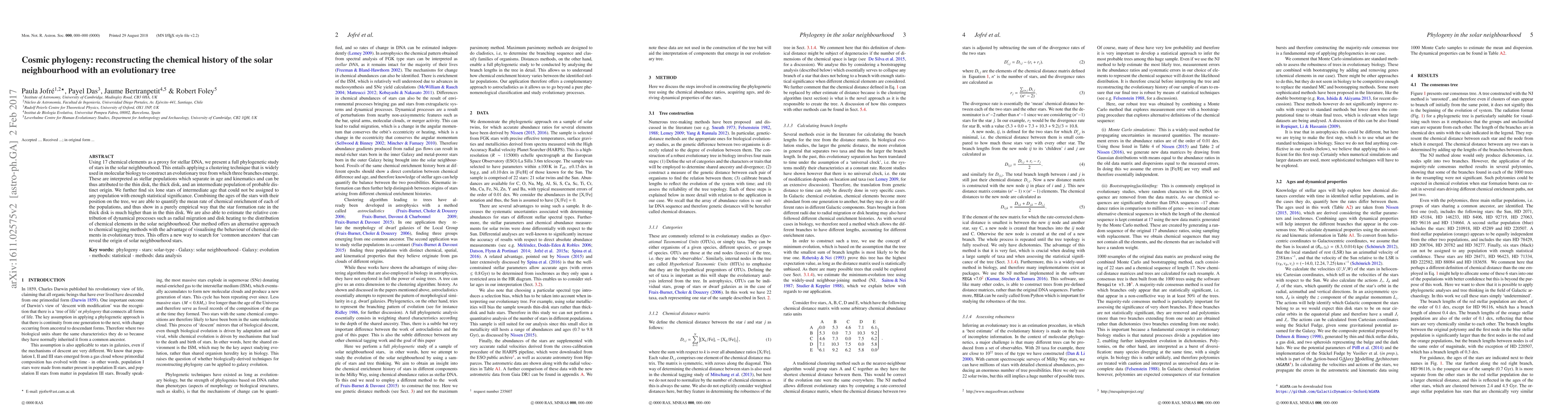 Using 17 chemical elements as a proxy for stellar DNA, we present a full phylogenetic study of stars in the solar neighbourhood. This entails applying a clustering technique that is widely used in molecular biology to construct an evolutionary tree from which three branches emerge. These are interpreted as stellar populations which separate in age and kinematics and can be thus attributed to the thin disk, the thick disk, and an intermediate population of probable distinct origin. We further find six lone stars of intermediate age that could not be assigned to any population with enough statistical significance. Combining the ages of the stars with their position on the tree, we are able to quantify the mean rate of chemical enrichment of each of the populations, and thus show in a purely empirical way that the star formation rate in the thick disk is much higher than in the thin disk. We are also able to estimate the relative contribution of dynamical processes such as radial migration and disk heating to the distribution of chemical elements in the solar neighbourhood. Our method offers an alternative approach to chemical tagging methods with the advantage of visualising the behaviour of chemical elements in evolutionary trees. This offers a new way to search for `common ancestors' that can reveal the origin of solar neighbourhood stars.