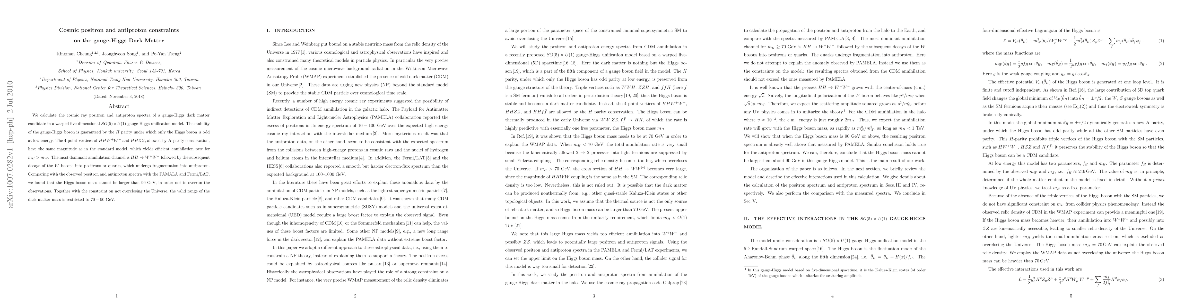 This paper investigates the cosmic ray positron and antiproton spectra from a gauge-Higgs dark matter candidate in a $SO(5) \times U(1)$ model, finding that the Higgs boson mass must be ≤ 90 GeV to align with observational data and not overclose the Universe. The valid dark matter mass range is thus constrained to 70-90 GeV.