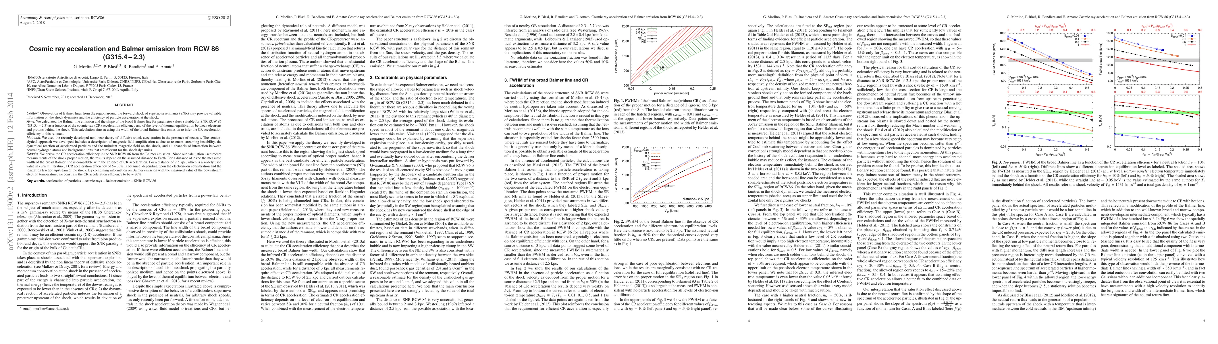 This study investigates the Balmer emission from supernova remnant RCW 86 to infer cosmic ray acceleration efficiency, finding that for a distance of 2.5 kpc, the efficiency ranges from 5-30%, with a constrained value of ~20% when combined with electron temperature data.
