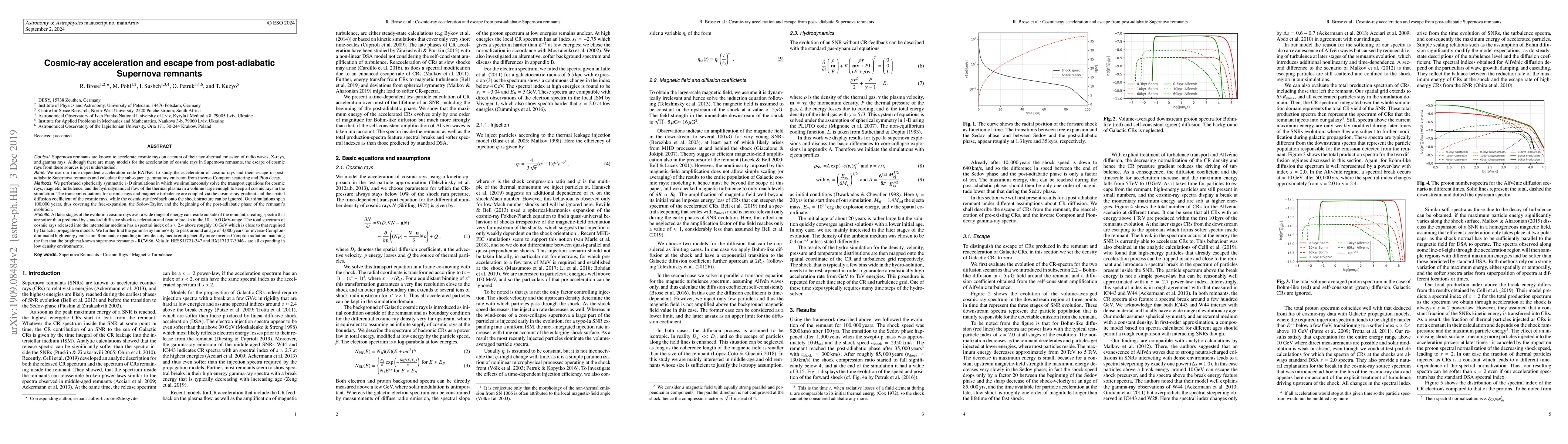 This paper investigates cosmic-ray acceleration and escape in post-adiabatic supernova remnants using a time-dependent acceleration code. It finds that cosmic rays can escape at later stages, resulting in softer spectra and breaks in the 10-100 GeV range, with gamma-ray luminosity peaking around 4,000 years.