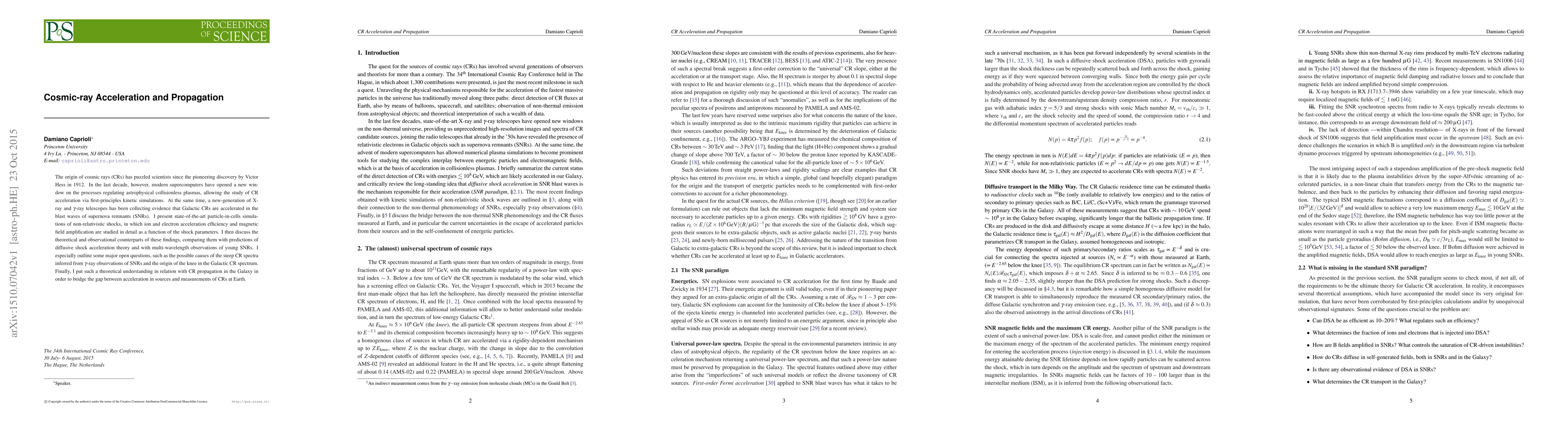 The origin of cosmic rays (CRs) has puzzled scientists since the pioneering discovery by Victor Hess in 1912. In the last decade, however, modern supercomputers have opened a new window on the processes regulating astrophysical collisionless plasmas, allowing the study of CR acceleration via first-principles kinetic simulations. At the same time, a new-generation of X-ray and $\gamma$-ray telescopes has been collecting evidence that Galactic CRs are accelerated in the blast waves of supernova remnants (SNRs). I present state-of-the-art particle-in-cells simulations of non-relativistic shocks, in which ion and electron acceleration efficiency and magnetic field amplification are studied in detail as a function of the shock parameters. I then discuss the theoretical and observational counterparts of these findings, comparing them with predictions of diffusive shock acceleration theory and with multi-wavelength observations of young SNRs. I especially outline some major open questions, such as the possible causes of the steep CR spectra inferred from $\gamma$-ray observations of SNRs and the origin of the knee in the Galactic CR spectrum. Finally, I put such a theoretical understanding in relation with CR propagation in the Galaxy in order to bridge the gap between acceleration in sources and measurements of CRs at Earth.