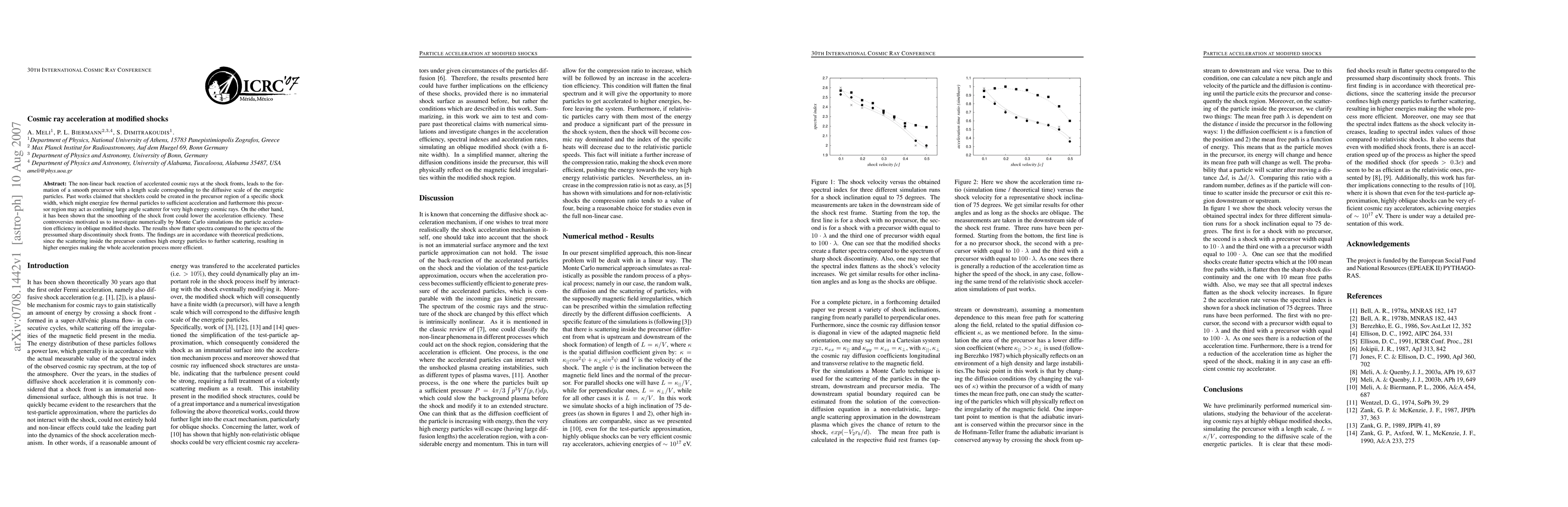 This paper investigates cosmic ray acceleration at modified shock fronts using Monte Carlo simulations, finding that smoother shock fronts lead to flatter spectra and more efficient acceleration compared to sharp discontinuities, due to the precursor region's role in confining high-energy particles.