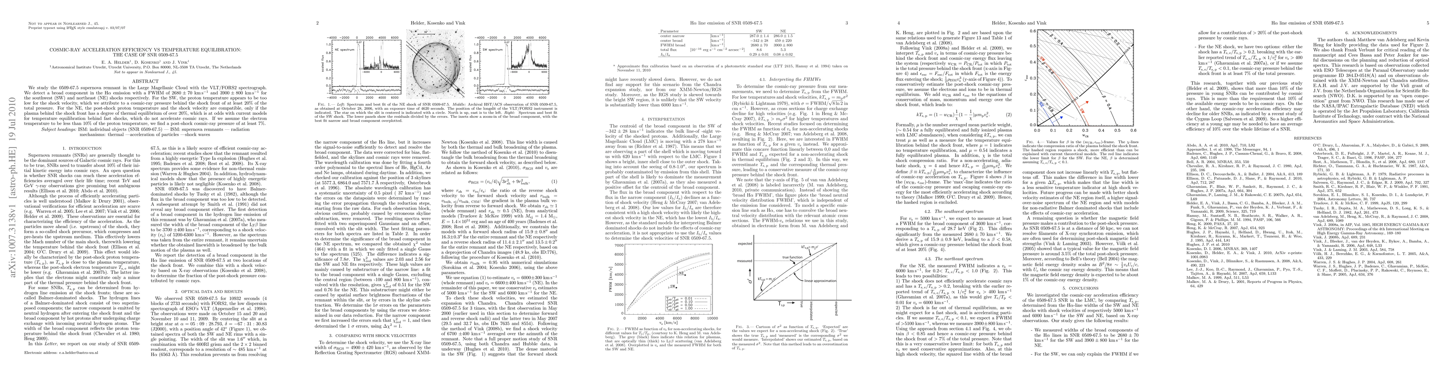 We study the 0509-67.5 supernova remnant in the Large Magellanic Cloud with the VLT/FORS2 spectrograph. We detect a broad component in the H-alpha emission with a FWHM of 2680 \pm 70 km/s and 3900 \pm 800 km/s for the southwest (SW) and northeast (NE) shocks respectively. For the SW, the proton temperature appears to be too low for the shock velocity, which we attribute to a cosmic-ray pressure behind the shock front of at least 20% of the total pressure. For the NE, the post-shock proton temperature and the shock velocity are compatible, only if the plasma behind the shock front has a degree of thermal equilibrium of over 20%, which is at odds with current models for temperature equilibration behind fast shocks, which do not accelerate cosmic rays. If we assume the electron temperature to be less than 10% of the proton temperature, we find a post-shock cosmic-ray pressure of at least 7%.