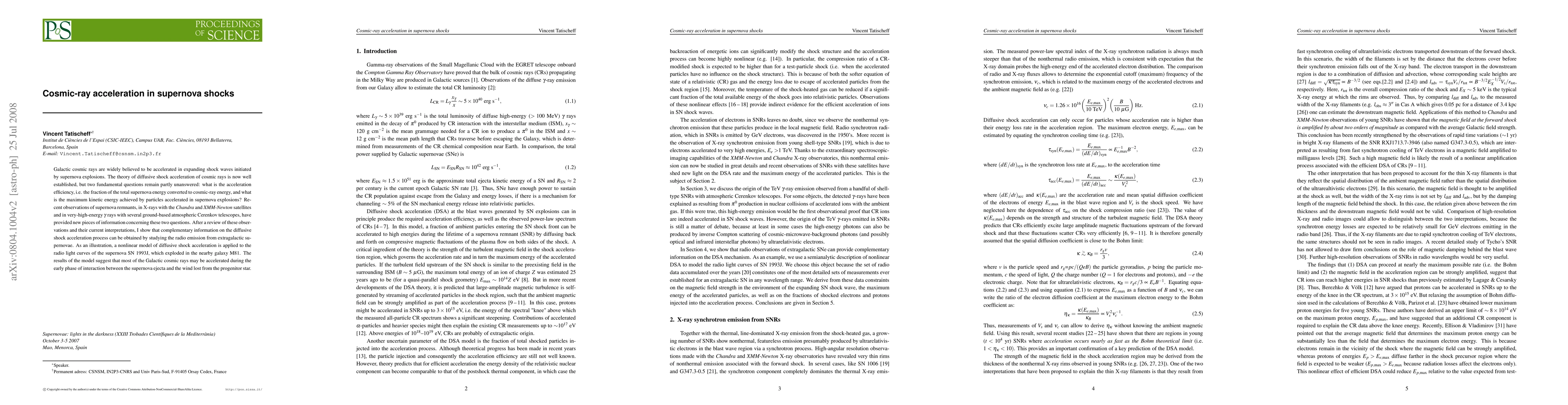 This paper explores the efficiency of cosmic-ray acceleration in supernova shocks and the maximum kinetic energy achieved by accelerated particles, using observations from X-ray and gamma-ray satellites and ground-based telescopes. It applies a nonlinear model to the radio light curve of SN 1993J, suggesting that early-phase interactions significantly contribute to the acceleration of Galactic cosmic rays.