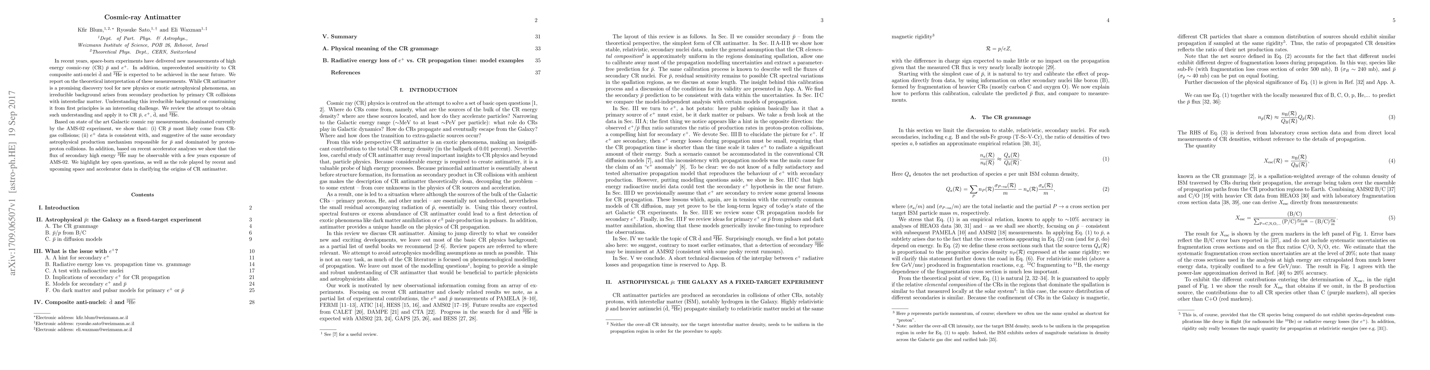 This paper reviews theoretical interpretations of recent measurements of high-energy cosmic-ray antimatter, including $\bar p$, $e^+$, anti-d, and anti-He, emphasizing the challenge of distinguishing between secondary production from interstellar collisions and potential new physics signals. It suggests that $\bar p$ and $e^+$ likely originate from secondary astrophysical processes, while highlighting the potential for AMS-02 to observe anti-He with further exposure.