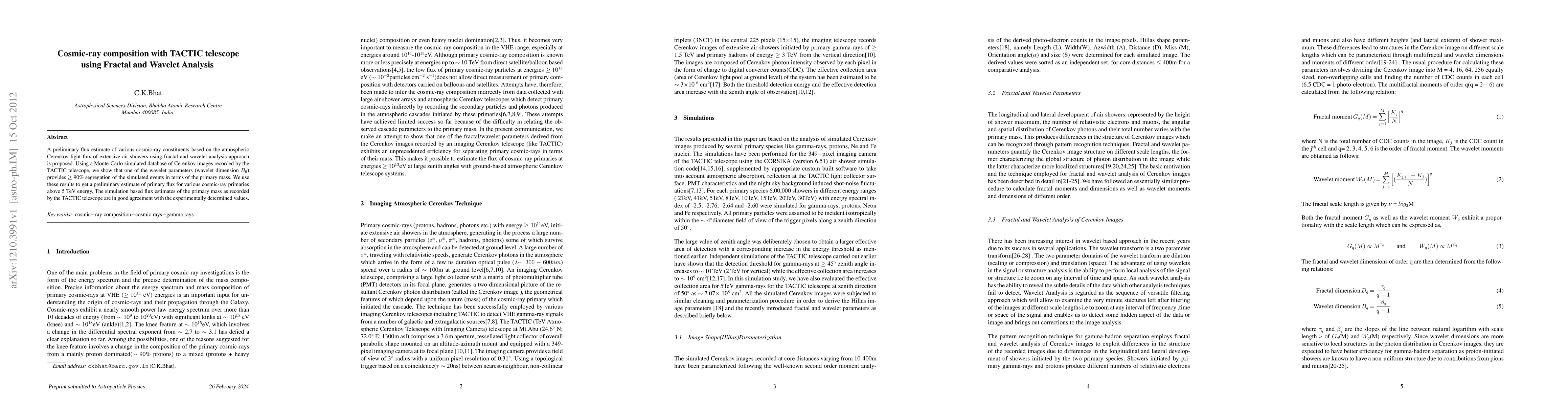 This paper proposes a method using fractal and wavelet analysis to estimate cosmic-ray composition via atmospheric Cerenkov light flux from extensive air showers detected by the TACTIC telescope. The study finds that a specific wavelet parameter (B6) effectively separates simulated events by primary mass, leading to preliminary flux estimates for cosmic-ray primaries above 5 TeV that align well with experimental values.