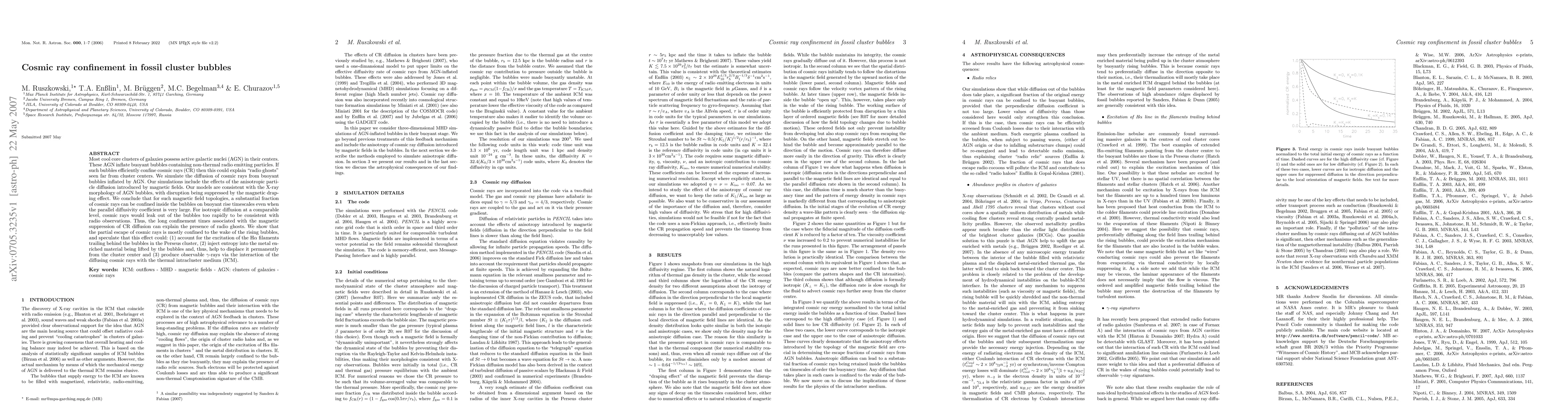 This paper investigates the confinement of cosmic rays within buoyant bubbles inflated by active galactic nuclei in cool core clusters, finding that anisotropic diffusion due to magnetic fields allows for substantial cosmic ray retention. The simulations suggest that this effect can explain the presence of radio ghosts and potentially influence the cluster's intracluster medium through the excitation of H$\alpha$ filaments and the production of $\gamma$-rays.