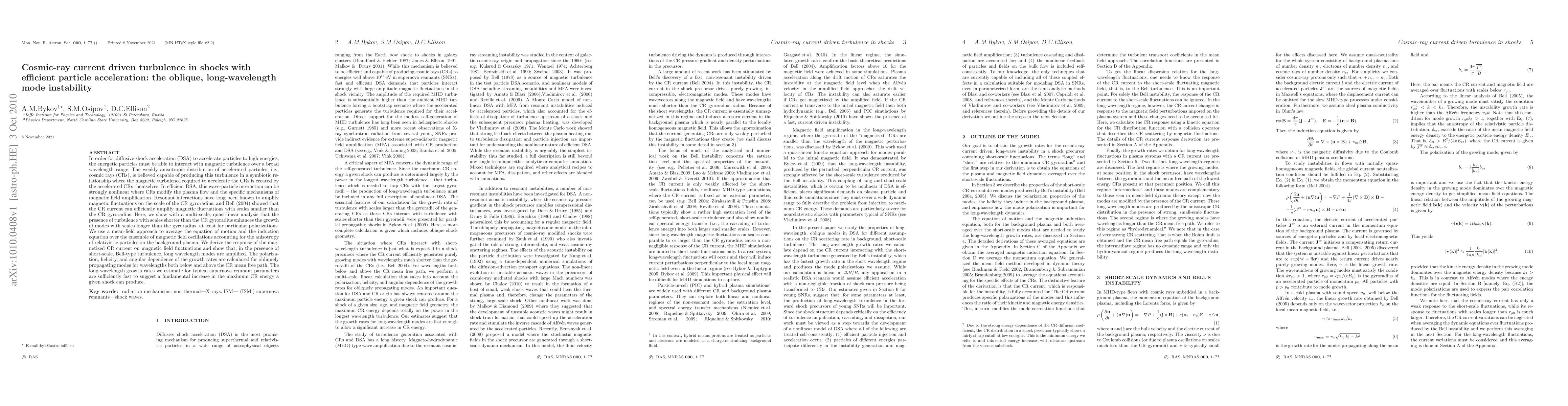 In order for diffusive shock acceleration (DSA) to accelerate particles to high energies, the energetic particles must be able to interact with magnetic turbulence over a broad wavelength range. The weakly anisotropic distribution of accelerated particles, i.e., cosmic rays (CRs), is believed capable of producing this turbulence in a symbiotic relationship where the magnetic turbulence required to accelerate the CRs is created by the accelerated CRs themselves. In efficient DSA, this wave-particle interaction can be strongly nonlinear where CRs modify the plasma flow and the specific mechanisms of magnetic field amplification. Resonant interactions have long been known to amplify magnetic fluctuations on the scale of the CR gyroradius, and Bell (2004) showed that the CR current can efficiently amplify magnetic fluctuations with scales smaller than the CR gyroradius. Here, we show with a multi-scale, quasi-linear analysis that the presence of turbulence with scales shorter than the CR gyroradius enhances the growth of modes with scales longer than the gyroradius, at least for particular polarizations. We use a mean-field approach to average the equation of motion and the induction equation over the ensemble of magnetic field oscillations accounting for the anisotropy of relativistic particles on the background plasma. We derive the response of the magnetized CR current on magnetic field fluctuations and show that, in the presence of short-scale, Bell-type turbulence, long wavelength modes are amplified. The polarization, helicity, and angular dependence of the growth rates are calculated for obliquely propagating modes for wavelengths both below and above the CR mean free path. The long wavelength growth rates we estimate for typical supernova remnant parameters are sufficiently fast to suggest a fundamental increase in the maximum CR energy a given shock can produce.