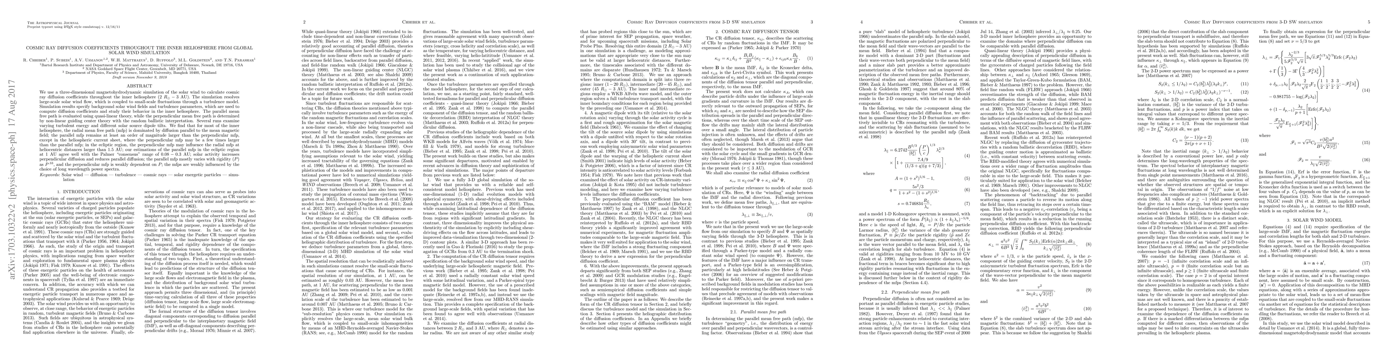 We use a three-dimensional magnetohydrodynamic simulation of the solar wind to calculate cosmic ray diffusion coefficients throughout the inner heliosphere ($2~R_\odot - 3$ AU). The simulation resolves large-scale solar wind flow, which is coupled to small-scale fluctuations through a turbulence model. Simulation results specify background solar wind fields and turbulence parameters, which are used to compute diffusion coefficients and study their behavior in the inner heliosphere. The parallel mean free path is evaluated using quasi-linear theory, while the perpendicular mean free path is determined by non-linear guiding center theory with the random ballistic interpretation. Several runs examine varying turbulent energy and different solar source dipole tilts. We find that for most of the inner heliosphere, the radial mean free path (mfp) is dominated by diffusion parallel to the mean magnetic field; the parallel mfp remains at least an order of magnitude larger than the perpendicular mfp, except in the heliospheric current sheet, where the perpendicular mfp may be a few times larger than the parallel mfp; in the ecliptic region, the perpendicular mfp may influence the radial mfp at heliocentric distances larger than 1.5 AU; our estimations of the parallel mfp in the ecliptic region at 1 AU agree well with the Palmer "consensus" range of $0.08 - 0.3$ AU; solar activity increases perpendicular diffusion and reduces parallel diffusion; the parallel mfp varies with rigidity $(P)$ as $P^{.33}$, and the perpendicular mfp is weakly dependent on $P$; the mfps are weakly influenced by the choice of long wavelength power spectra.