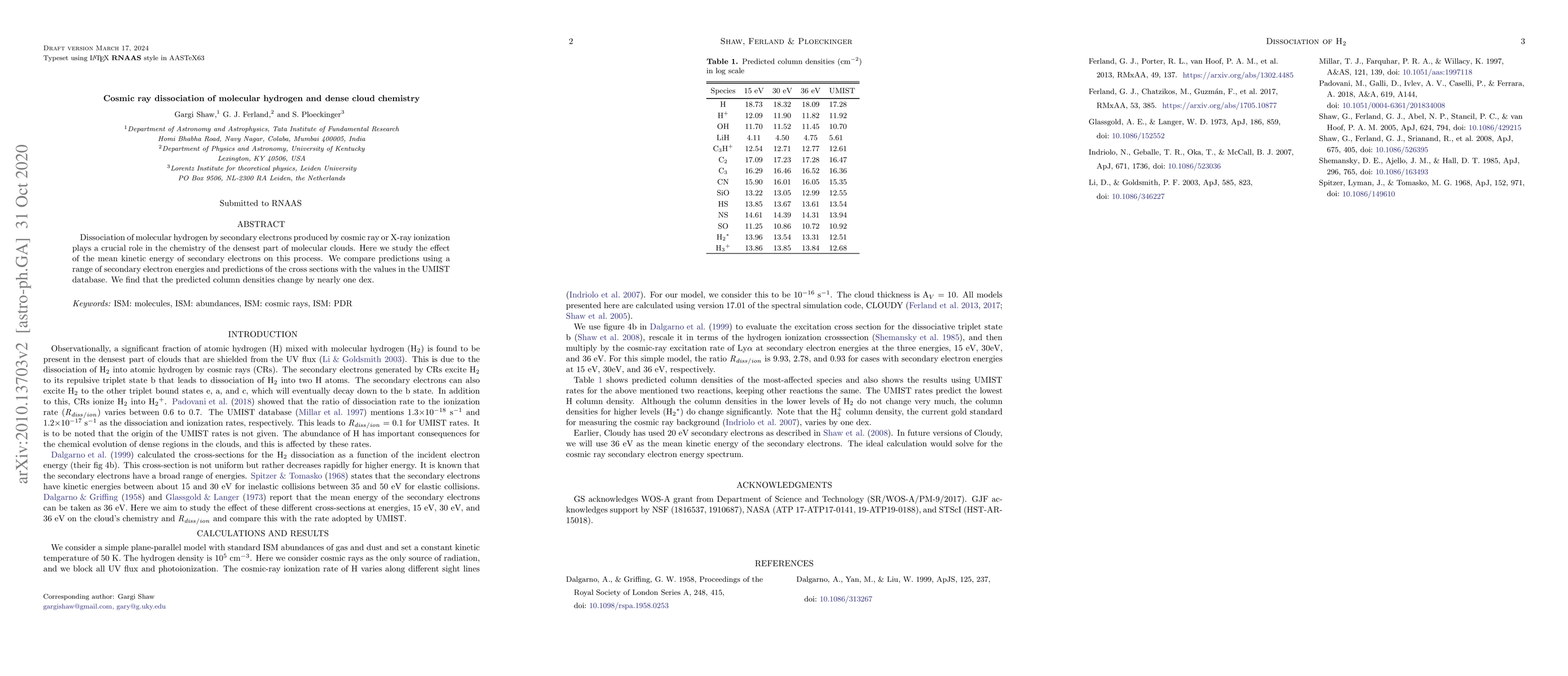 Research on cosmic rays finds that dissociation of molecular hydrogen affects dense cloud chemistry, with varying energy levels altering column densities by nearly one dex.