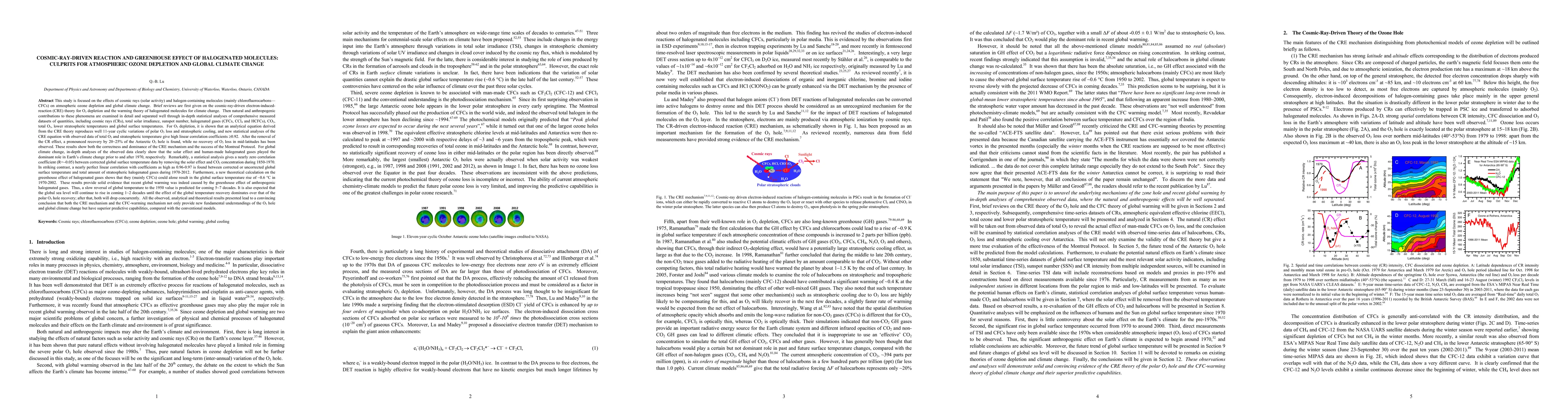 This study investigates the roles of cosmic rays and halogenated molecules, particularly CFCs, in atmospheric ozone depletion and global climate change. It finds that cosmic rays significantly deplete ozone, while human-made halogenated gases are the primary drivers of recent global warming, with CFCs contributing to a ~0.6°C temperature rise.