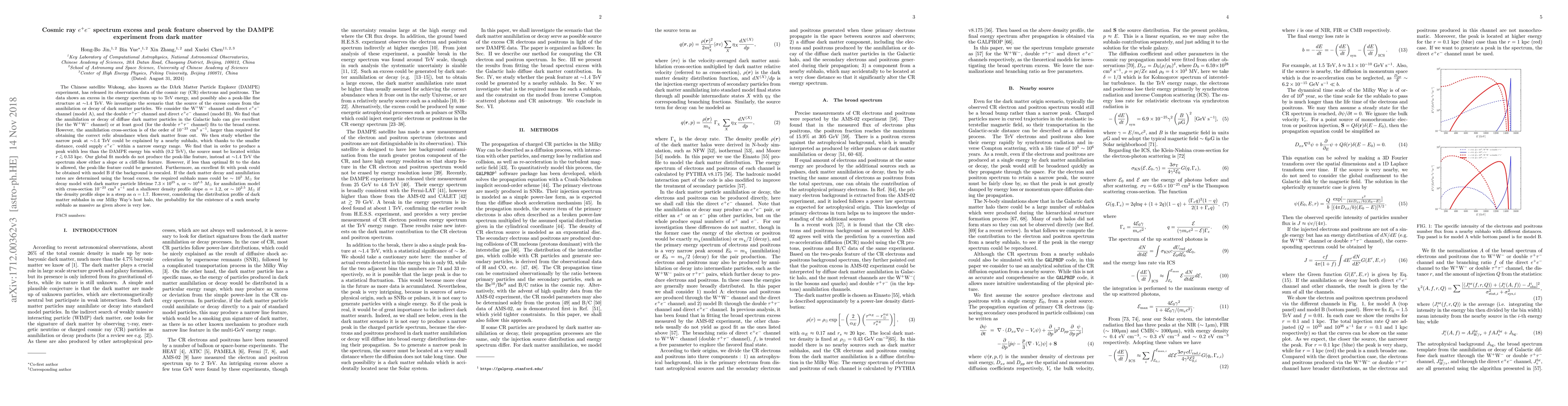 The Chinese satellite Wukong, also known as the DArk Matter Particle Explorer (DAMPE), has released its observation data of the cosmic ray (CR) electrons and positrons. The data shows an excess in the energy spectrum up to TeV energy, and possibly a peak-like fine structure at $\sim 1.4 \TeV$. We investigate the scenario that the source of the excess comes from dark matter annihilation or decay. We find that the annihilation or decay of diffuse dark matter particles in the Galactic halo can give excellent ($W^+W^-$ channel) or at least good (double $\tau^+\tau^-$ channel) fits to the broad excess. However, the annihilation cross-section is $10^{-23}\cm^3s^{-1}$, larger than required for getting the correct relic abundance. We then study whether the narrow peak at $\sim 1.4\TeV$ could be explained by a nearby subhalo, which thanks to the smaller distance, could supply $e^+e^-$ within a narrow energy range. We find that in order to produce a peak width less than the energy bin width (0.2 TeV), the source must be located within $r\lsim 0.53~\kpc$. Our global fit models do not produce the peak-like feature, instead at 1.4 TeV the spectrum show either a slope or a cliff-like feature. However, if less than optimal fit is allowed, the peak-like feature could be generated. Furthermore, an excellent fit with peak could be obtained with model B if the background is rescaled. If the dark matter decay and annihilation rates are determined using the broad excess, the required subhalo mass $\sim10^{5}~M_\odot$ for decay model, or $\sim10^{4.5}\Msun$ for annihilation model and a shallower density profile slope $\alpha=1.2$, or $\sim10^{2.5}\Msun$ for the steep density profile $\alpha=1.7$. However, the probability for the existence of a such nearby subhalo as massive as given above is very low.
