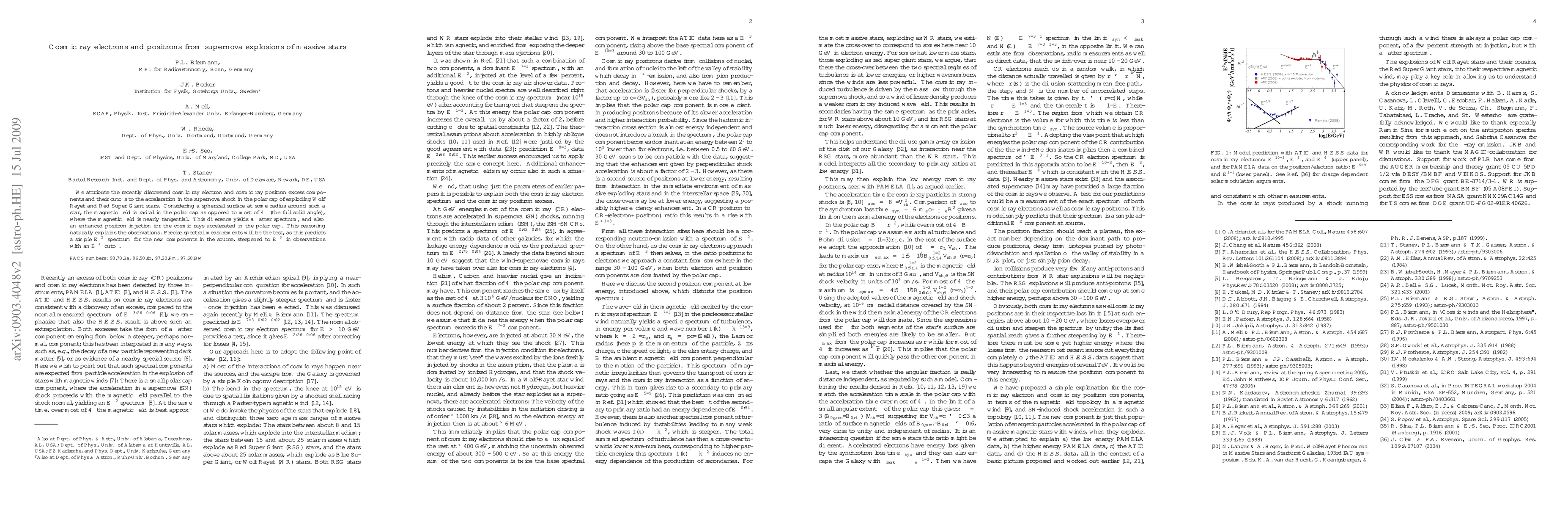 We attribute the recently discovered cosmic ray electron and cosmic ray positron excess components and their cutoffs to the acceleration in the supernova shock in the polar cap of exploding Wolf Rayet and Red Super Giant stars. Considering a spherical surface at some radius around such a star, the magnetic field is radial in the polar cap as opposed to most of 4 pi (the full solid angle), where the magnetic field is nearly tangential. This difference yields a flatter spectrum, and also an enhanced positron injection for the cosmic rays accelerated in the polar cap. This reasoning naturally explains the observations. Precise spectral measurements will be the test, as this predicts a simple E^-2 spectrum for the new components in the source, steepened to E^-3 in observations with an E^-4 cutoff.