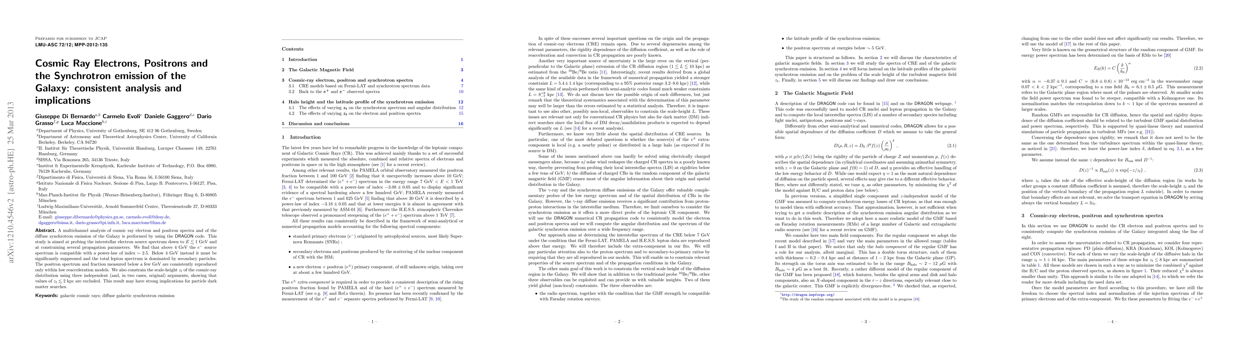 A multichannel analysis of cosmic ray electron and positron spectra and of the diffuse synchrotron emission of the Galaxy is performed by using the DRAGON code. This study is aimed at probing the interstellar electron source spectrum down to E ~ 1 GeV and at constraining several propagation parameters. We find that above 4 GeV the electron source spectrum is compatible with a power-law of index -2.5. Below 4 GeV instead it must be significantly suppressed and the total lepton spectrum is dominated by secondary particles. The positron spectrum and fraction measured below a few GeV are consistently reproduced only within low reacceleration models. We also constrain the scale-height zt of the cosmic-ray distribution using three independent (and, in two cases, original) arguments, showing that values of z_t < 2 kpc are excluded. This result may have strong implications for particle dark matter searches.