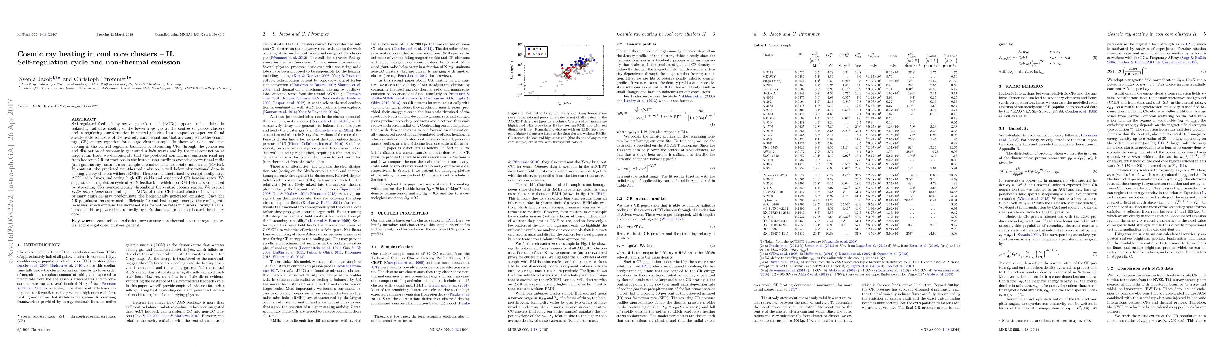 Self-regulated feedback by active galactic nuclei (AGNs) appears to be critical in balancing radiative cooling of the low-entropy gas at the centres of galaxy clusters and in regulating star formation in central galaxies. In a companion paper, we found steady-state solutions of the hydrodynamic equations that are coupled to the CR energy equation for a large cluster sample. In those solutions, radiative cooling in the central region is balanced by streaming CRs through the generation and dissipation of resonantly generated Alfv{\'e}n waves and by thermal conduction at large radii. Here we demonstrate that the predicted non-thermal emission resulting from hadronic CR interactions in the intra-cluster medium exceeds observational radio (and gamma-ray) data in a subsample of clusters that host radio mini halos (RMHs). In contrast, the predicted non-thermal emission is well below observational data in cooling galaxy clusters without RMHs. These are characterised by exceptionally large AGN radio fluxes, indicating high CR yields and associated CR heating rates. We suggest a self-regulation cycle of AGN feedback in which non-RMH clusters are heated by streaming CRs homogeneously throughout the central cooling region. We predict {\em radio micro halos} surrounding the AGNs of these CR-heated clusters in which the primary emission may predominate the hadronically generated emission. Once the CR population has streamed sufficiently far and lost enough energy, the cooling rate increases, which explains the increased star formation rates in clusters hosting RMHs. Those could be powered hadronically by CRs that have previously heated the cluster core.