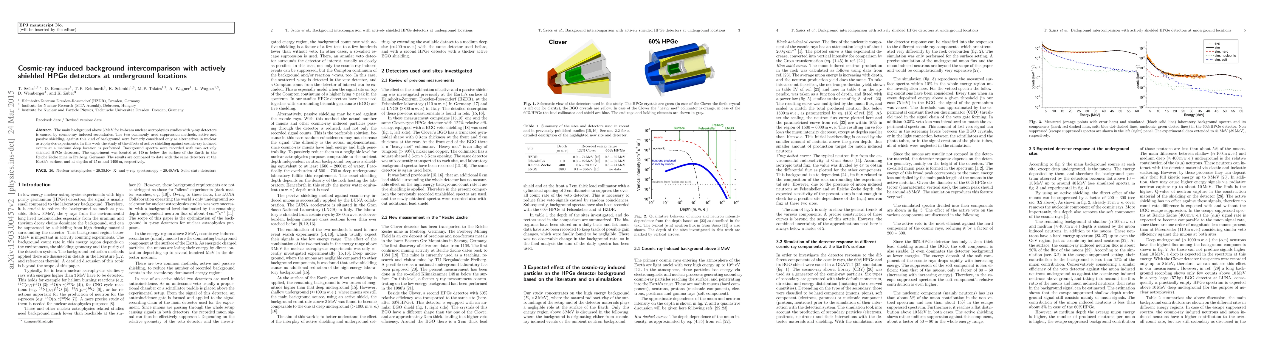 This study investigates cosmic-ray induced background levels above 3 MeV using actively shielded HPGe detectors at various depths, including 148 m below the surface in the Reiche Zeche mine in Freiberg, Germany. The results show significant reductions in background compared to surface measurements, highlighting the effectiveness of active shielding in nuclear astrophysics experiments.