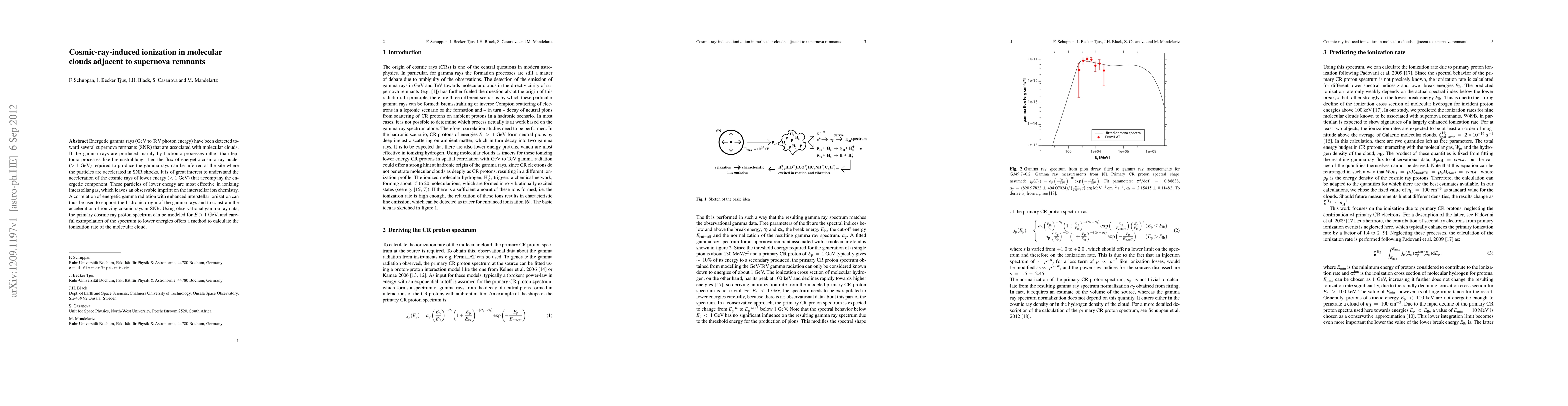 This paper investigates the ionization of molecular clouds near supernova remnants (SNR) by cosmic rays, focusing on the correlation between energetic gamma rays and interstellar ionization to support the hadronic origin of gamma rays. It uses gamma ray data to model the cosmic ray proton spectrum and extrapolates it to determine the ionization rate in the molecular clouds.