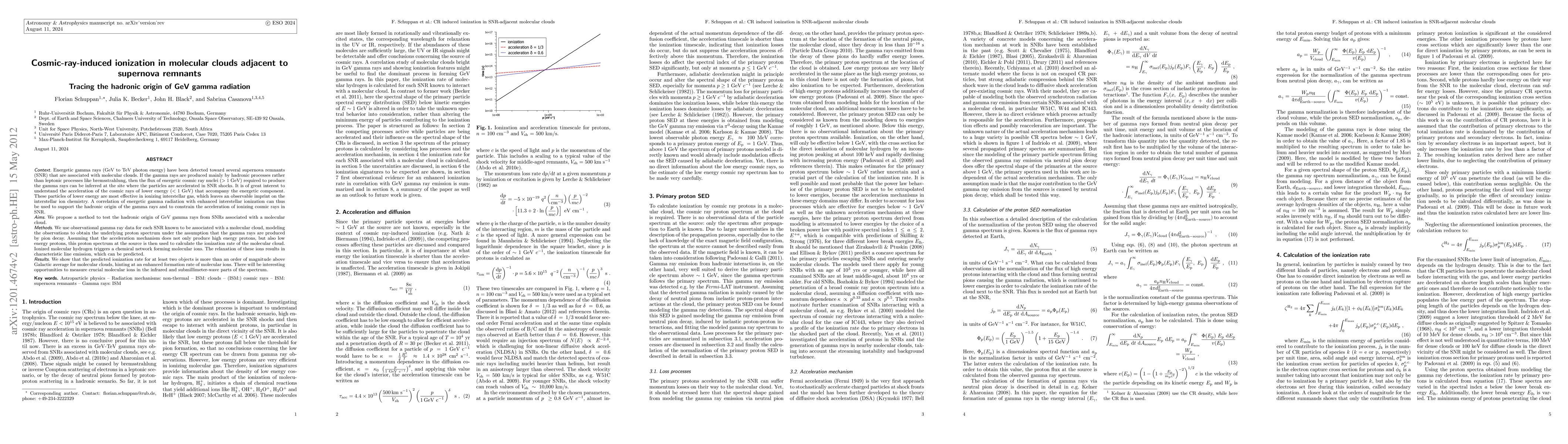 This paper investigates the cosmic-ray-induced ionization in molecular clouds near supernova remnants (SNR) to trace the hadronic origin of GeV gamma radiation. It proposes a method to correlate enhanced interstellar ionization with energetic gamma rays, suggesting that the ionization rate is significantly higher than the Galactic average, supporting the hadronic production mechanism.
