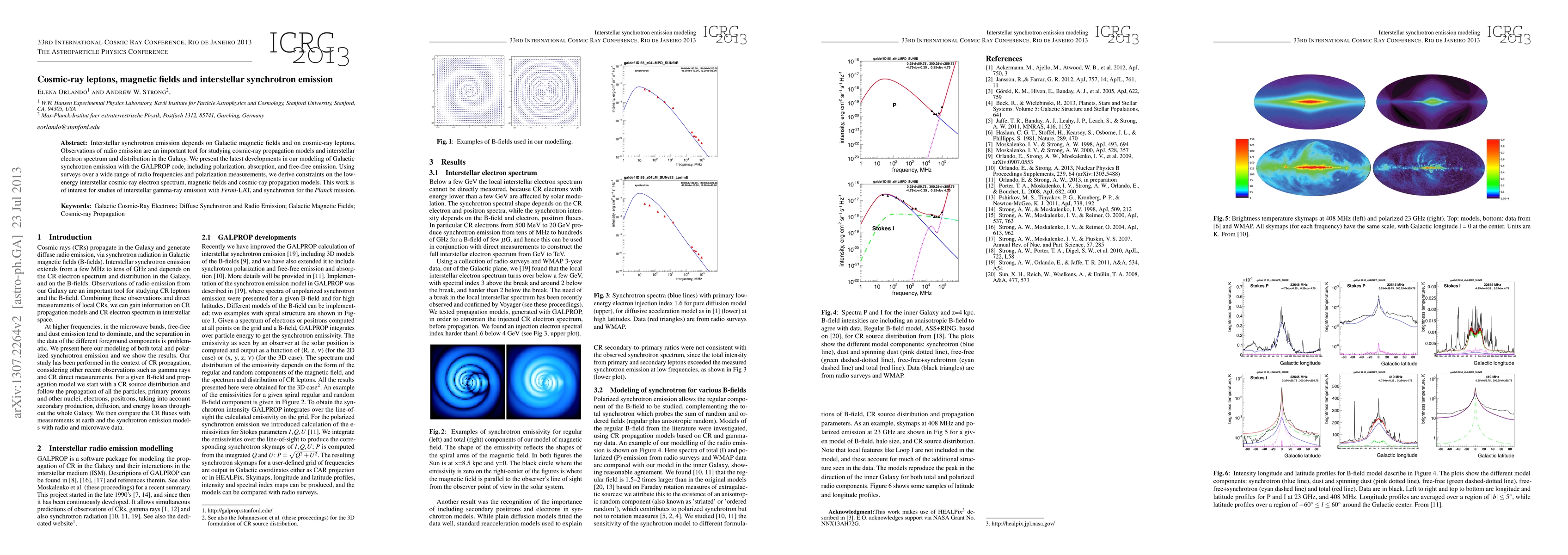Interstellar synchrotron emission depends on Galactic magnetic fields and on cosmic-ray leptons. Observations of radio emission are an important tool for studying cosmic-ray propagation models and interstellar electron spectrum and distribution in the Galaxy. We present the latest developments in our modeling of Galactic synchrotron emission with the GALPROP code, including polarization, absorption, and free-free emission. Using surveys over a wide range of radio frequencies and polarization measurements, we derive constraints on the low-energy interstellar cosmic-ray electron spectrum, magnetic fields and cosmic-ray propagation models. This work is of interest for studies of interstellar gamma-ray emission with Fermi-LAT, and synchrotron for the Planck mission.