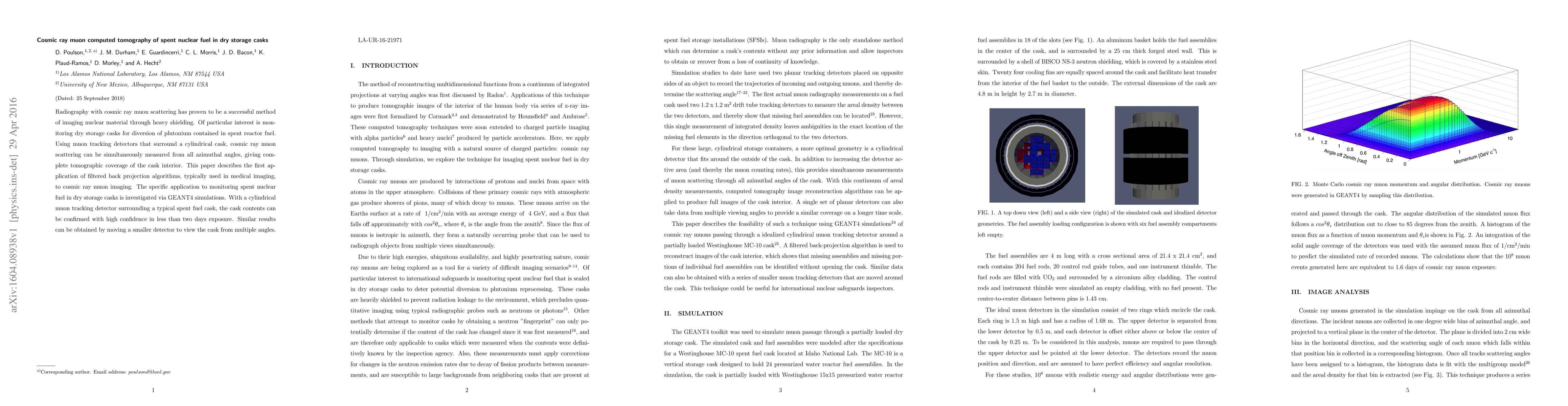 This paper explores the use of cosmic ray muon scattering for imaging spent nuclear fuel in dry storage casks, employing filtered back projection algorithms for tomographic reconstruction. GEANT4 simulations demonstrate the feasibility of confirming cask contents with high confidence in less than two days using either a stationary or a mobile cylindrical muon tracking detector.
