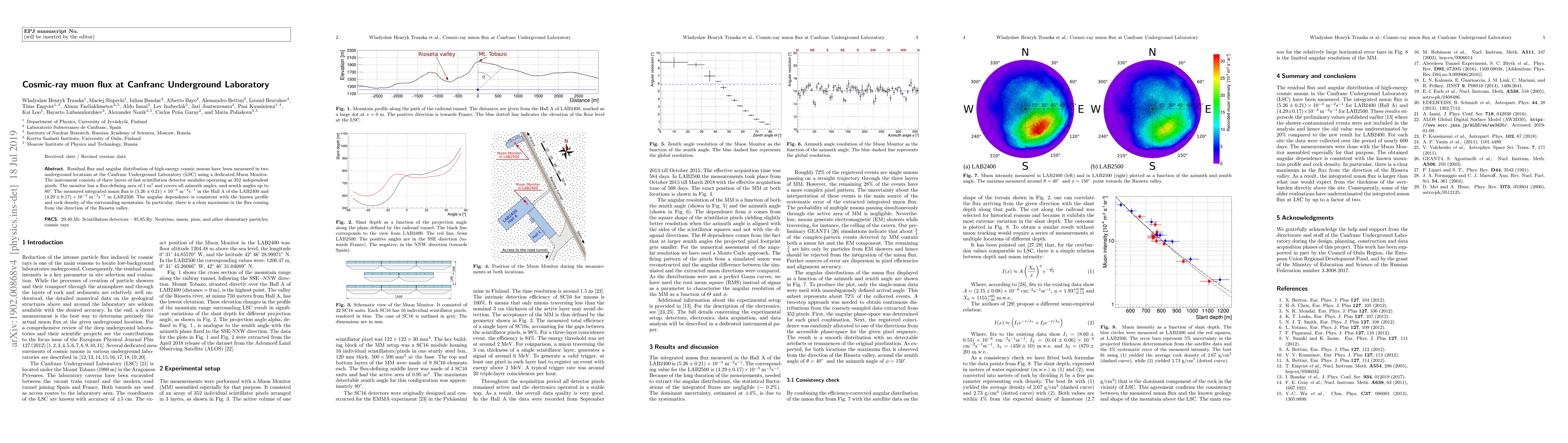 This study measures the residual flux and angular distribution of cosmic-ray muons at two underground locations in the Canfranc Underground Laboratory using a specialized Muon Monitor. The results show an integrated muon flux of $(5.26 \pm 0.21) \times 10^{-3}$ m${}^{-2}$s${}^{-1}$ in Hall A and $(4.29 \pm 0.17) \times 10^{-3}$ m${}^{-2}$s${}^{-1}$ in LAB2500, with a notable maximum flux from the Rioseta valley direction.