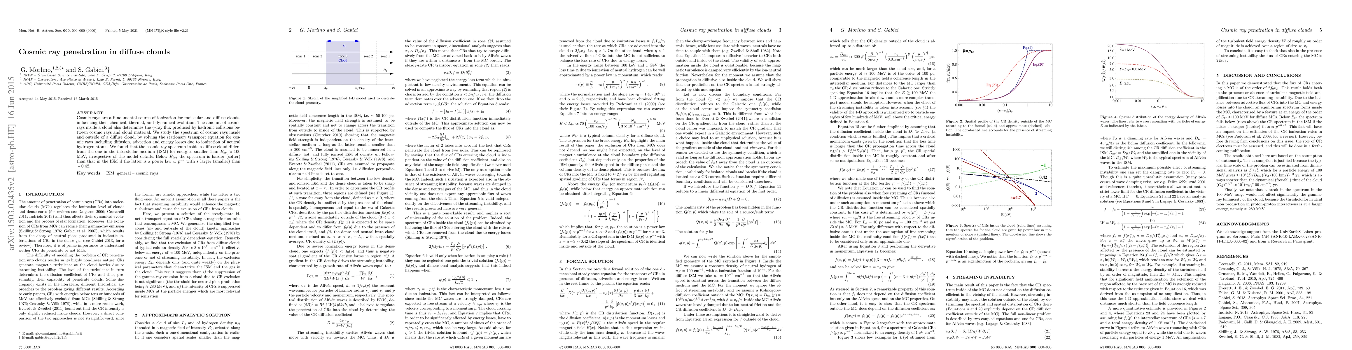 This paper investigates cosmic ray penetration in diffuse clouds, finding that cosmic ray spectra inside clouds differ from those in the interstellar medium for energies below 100 MeV, with the spectrum being harder (softer) than the interstellar medium's if the latter has a power law slope larger (smaller) than ~0.42.