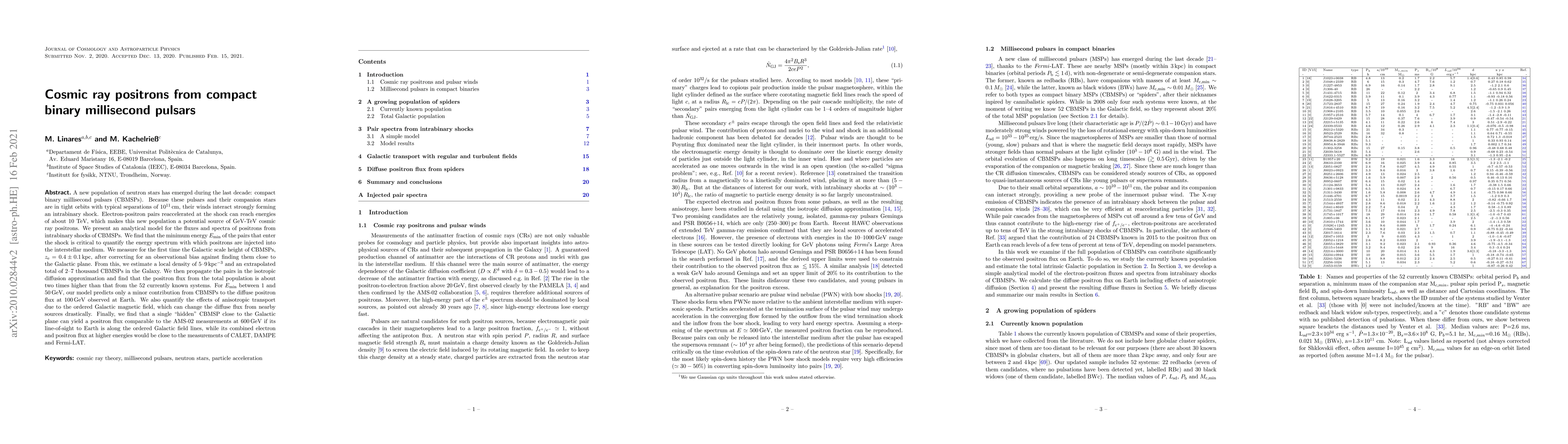 A new population of neutron stars has emerged during the last decade: compact binary millisecond pulsars (CBMSPs). Because these pulsars and their companion stars are in tight orbits with typical separations of $10^{11}$ cm, their winds interact strongly forming an intrabinary shock. Electron-positron pairs reaccelerated at the shock can reach energies of about 10 TeV, which makes this new population a potential source of GeV-TeV cosmic ray positrons. We present an analytical model for the fluxes and spectra of positrons from intrabinary shocks of CBMSPs. We find that the minimum energy $E_{\min}$ of the pairs that enter the shock is critical to quantify the energy spectrum with which positrons are injected into the interstellar medium. We measure for the first time the Galactic scale height of CBMSPs, $z_e=0.4\pm0.1$ kpc, after correcting for an observational bias against finding them close to the Galactic plane. From this, we estimate a local density of 5-9 kpc$^{-3}$ and an extrapolated total of 2-7 thousand CBMSPs in the Galaxy. We then propagate the pairs in the isotropic diffusion approximation and find that the positron flux from the total population is about two times higher than that from the 52 currently known systems. For $E_{\min}$ between 1 and 50 GeV, our model predicts only a minor contribution from CBMSPs to the diffuse positron flux at 100 GeV observed at Earth. We also quantify the effects of anisotropic transport due to the ordered Galactic magnetic field, which can change the diffuse flux from nearby sources drastically. Finally, we find that a single "hidden" CBMSP close to the Galactic plane can yield a positron flux comparable to the AMS-02 measurements at 600 GeV if its line-of-sight to Earth is along the ordered Galactic field lines, while its combined electron and positron flux at higher energies would be close to the measurements of CALET, DAMPE and Fermi-LAT.