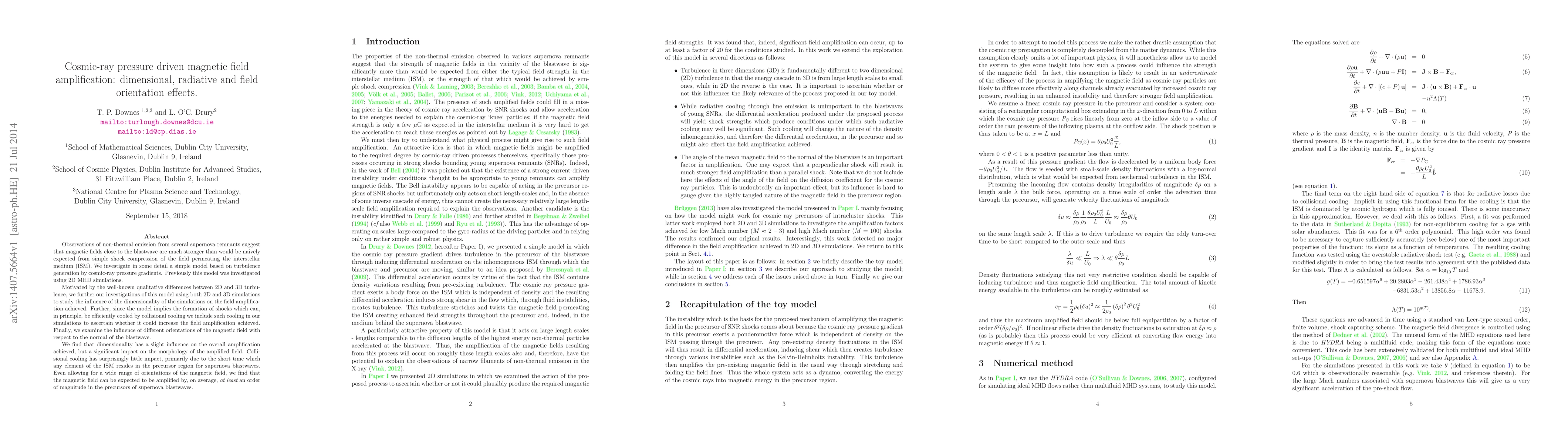 This paper investigates the amplification of magnetic fields near supernova blastwaves driven by cosmic-ray pressure gradients, using both 2D and 3D simulations. It finds that while dimensionality slightly affects amplification, magnetic fields can still be amplified by at least an order of magnitude, with collisional cooling having minimal impact due to short ISM residence times.