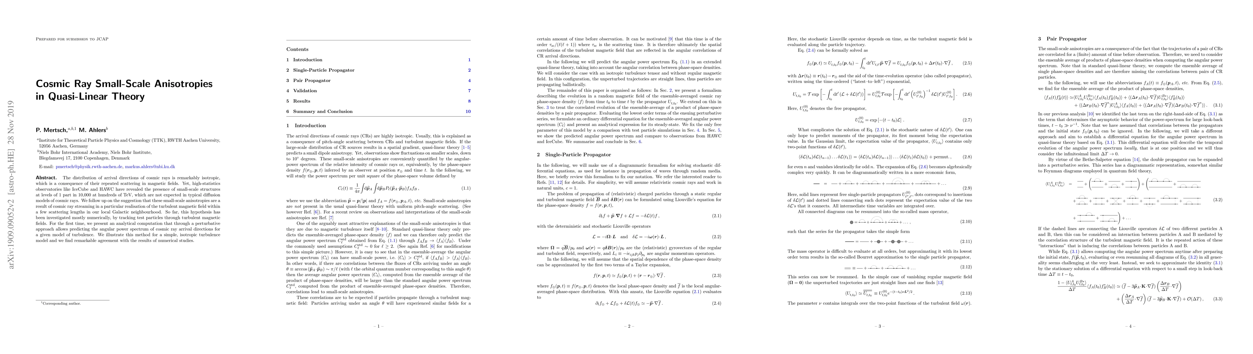 The distribution of arrival directions of cosmic rays is remarkably isotropic, which is a consequence of their repeated scattering in magnetic fields. Yet, high-statistics observatories like IceCube and HAWC have revealed the presence of small-scale structures at levels of 1 part in 10,000 at hundreds of TeV, which are not expected in typical diffusion models of cosmic rays. We follow up on the suggestion that these small-scale anisotropies are a result of cosmic ray streaming in a particular realisation of the turbulent magnetic field within a few scattering lengths in our local Galactic neighbourhood. So far, this hypothesis has been investigated mostly numerically, by tracking test particles through turbulent magnetic fields. For the first time, we present an analytical computation that through a perturbative approach allows predicting the angular power spectrum of cosmic ray arrival directions for a given model of turbulence. We illustrate this method for a simple, isotropic turbulence model and we find remarkable agreement with the results of numerical studies.