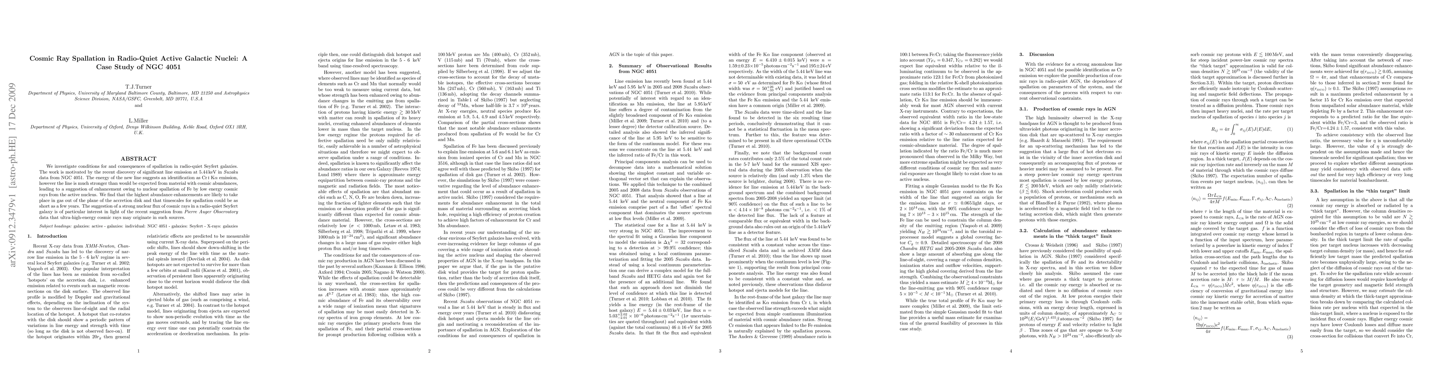 We investigate conditions for and consequences of spallation in radio-quiet Seyfert galaxies. The work is motivated by the recent discovery of significant line emission at 5.44 keV in Suzaku data from NGC 4051. The energy of the new line suggests an identification as Cr I Ka emission, however the line is much stronger than would be expected from material with cosmic abundances, leading to a suggestion of enhancement owing to nuclear spallation of Fe by low energy cosmic rays from the active nucleus. We find that the highest abundance enhancements are likely to take place in gas out of the plane of the accretion disk and that timescales for spallation could be as short as a few years. The suggestion of a strong nuclear flux of cosmic rays in a radio-quiet Seyfert galaxy is of particular interest in light of the recent suggestion from Pierre Auger Observatory data that ultra-high-energy cosmic rays may originate in such sources.