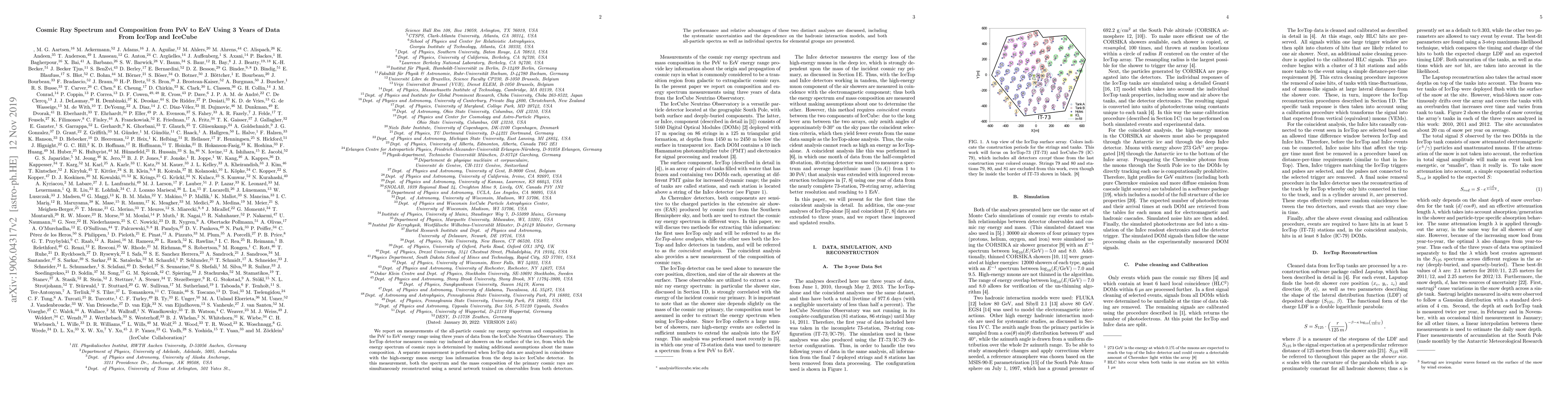 This paper reports on cosmic ray spectrum and composition measurements from PeV to EeV using three years of data from IceCube's IceTop and IceCube detectors. It compares two analysis methods: one using IceTop alone and the other combining IceTop and IceCube data to reconstruct cosmic ray spectra and mass composition.
