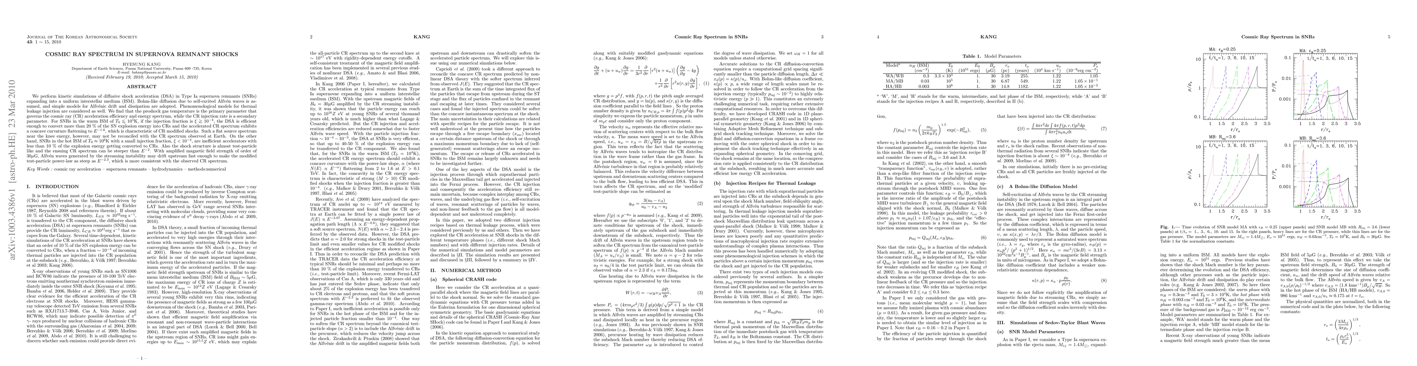 We perform kinetic simulations of diffusive shock acceleration (DSA) in Type Ia supernova remnants (SNRs) expanding into a uniform interstellar medium (ISM). Bohm-like diffusion assumed, and simple models for Alfvenic drift and dissipation are adopted. Phenomenological models for thermal leakage injection are considered as well. We find that the preshock gas temperature is the primary parameter that governs the cosmic ray (CR) acceleration efficiency and energy spectrum, while the CR injection rate is a secondary parameter. For SNRs in the warm ISM, if the injection fraction is larger than 10^{-4}, the DSA is efficient enough to convert more than 20 % of the SN explosion energy into CRs and the accelerated CR spectrum exhibits a concave curvature flattening to E^{-1.6}. Such a flat source spectrum near the knee energy, however, may not be reconciled with the CR spectrum observed at Earth. On the other hand, SNRs in the hot ISM, with an injection fraction smaller than 10^{-4}, are inefficient accelerators with less than 10 % of the explosion energy getting converted to CRs. Also the shock structure is almost test-particle like and the ensuing CR spectrum can be steeper than E^{-2}. With amplified magnetic field strength of order of 30 microG, Alfven waves generated by the streaming instability may drift upstream fast enough to make the modified test-particle power-law as steep as E^{-2.3}, which is more consistent with the observed CR spectrum.