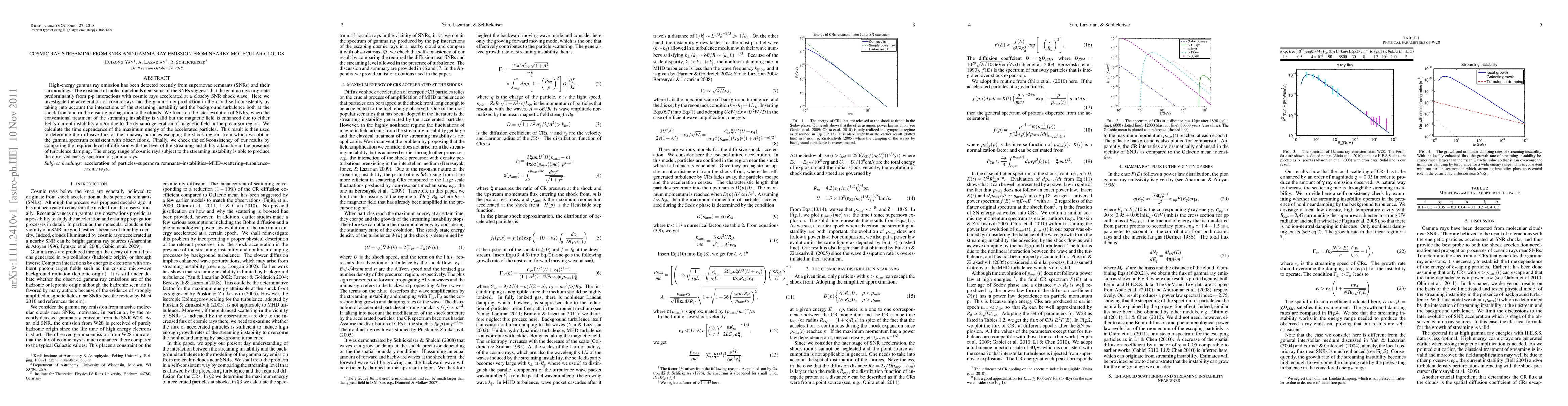 This paper investigates the acceleration of cosmic rays in supernova remnants (SNRs) and their interaction with nearby molecular clouds, leading to gamma-ray emission. The study considers the streaming instability and background turbulence, determining the energy spectrum of gamma rays consistent with observations.