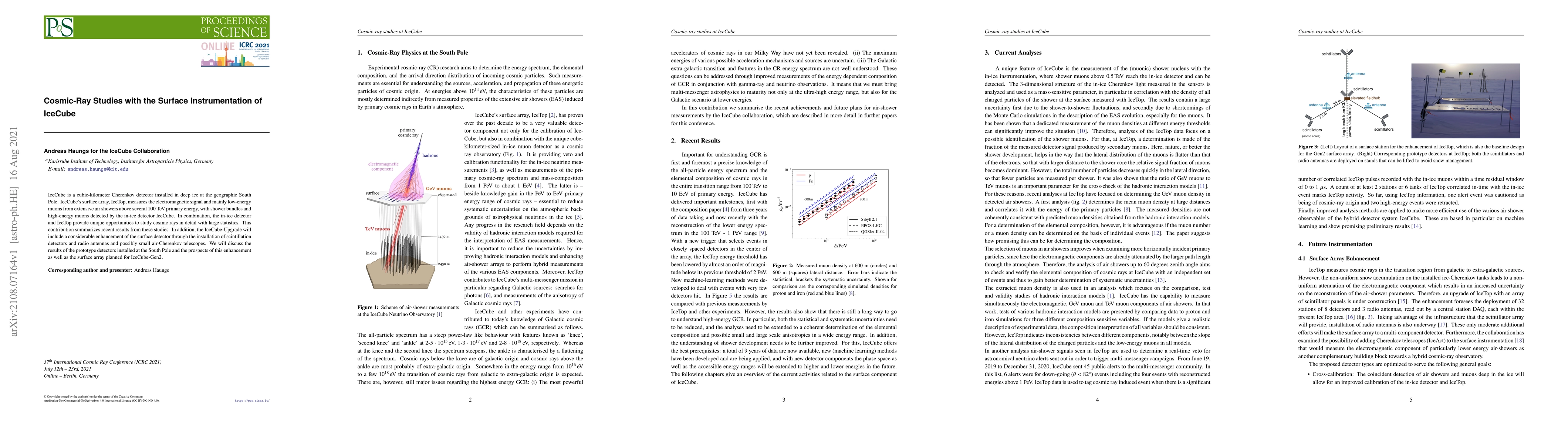 IceCube is a cubic-kilometer Cherenkov detector installed in deep ice at the geographic South Pole. IceCube's surface array, IceTop, measures the electromagnetic signal and mainly low-energy muons from extensive air showers above several 100 TeV primary energy, with shower bundles and high-energy muons detected by the in-ice detector IceCube. In combination, the in-ice detector and IceTop provide unique opportunities to study cosmic rays in detail with large statistics. This contribution summarizes recent results from these studies. In addition, the IceCube-Upgrade will include a considerable enhancement of the surface detector through the installation of scintillation detectors and radio antennas and possibly small air-Cherenkov telescopes. We will discuss the results of the prototype detectors installed at the South Pole and the prospects of this enhancement as well as the surface array planned for IceCube-Gen2.