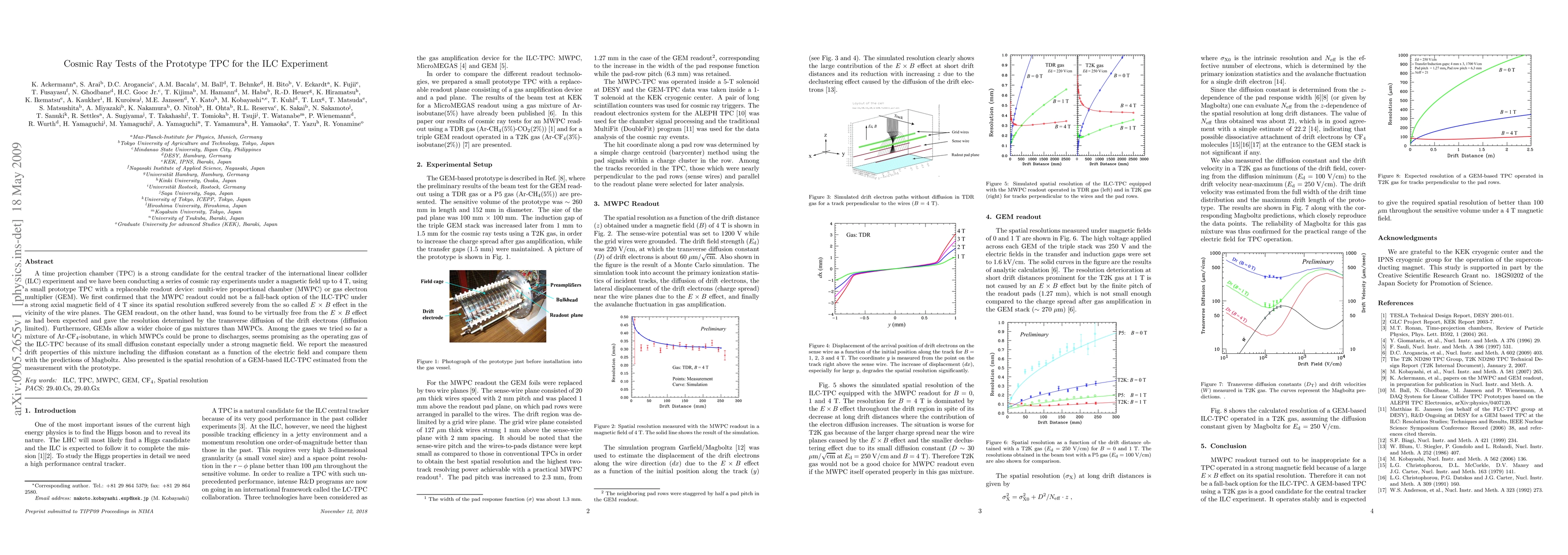 This paper investigates the performance of a prototype time projection chamber (TPC) for the ILC experiment using cosmic ray tests. The study found that the multi-wire proportional chamber (MWPC) readout is unsuitable under strong magnetic fields due to the E x B effect, while the gas electron multiplier (GEM) readout performed well, offering better spatial resolution and flexibility in gas mixtures.