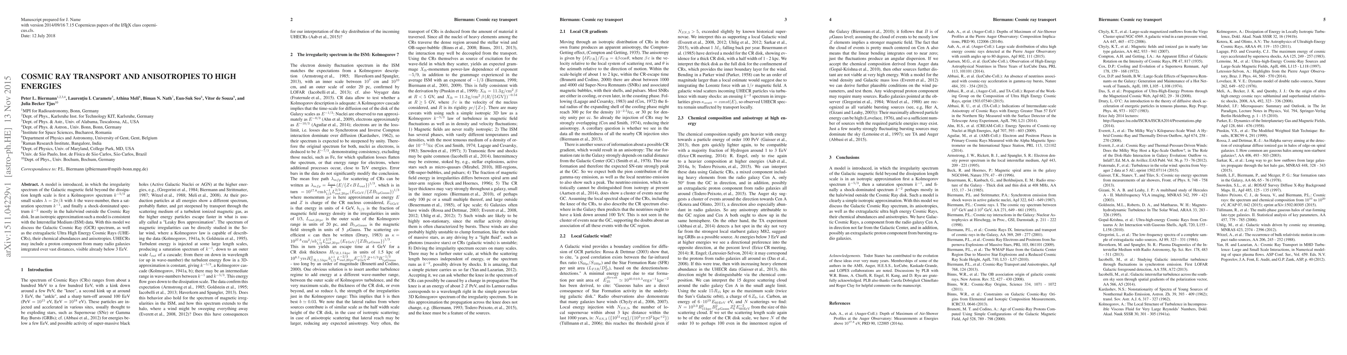 A model is introduced, in which the irregularity spectrum of the Galactic magnetic field beyond the dissipation length scale is first a Kolmogorov spectrum $k^{-5/3}$ at small scales $\lambda \, = \, 2 \pi/k$ with $k$ the wave-number, then a saturation spectrum $k^{-1}$, and finally a shock-dominated spectrum $k^{-2}$ mostly in the halo/wind outside the Cosmic Ray disk. In an isotropic approximation such a model is consistent with the Interstellar Medium (ISM) data. With this model we discuss the Galactic Cosmic Ray (GCR) spectrum, as well as the extragalactic Ultra High Energy Cosmic Rays (UHECRs), their chemical abundances and anisotropies. UHECRs may include a proton component from many radio galaxies integrated over vast distances, visible already below 3 EeV.