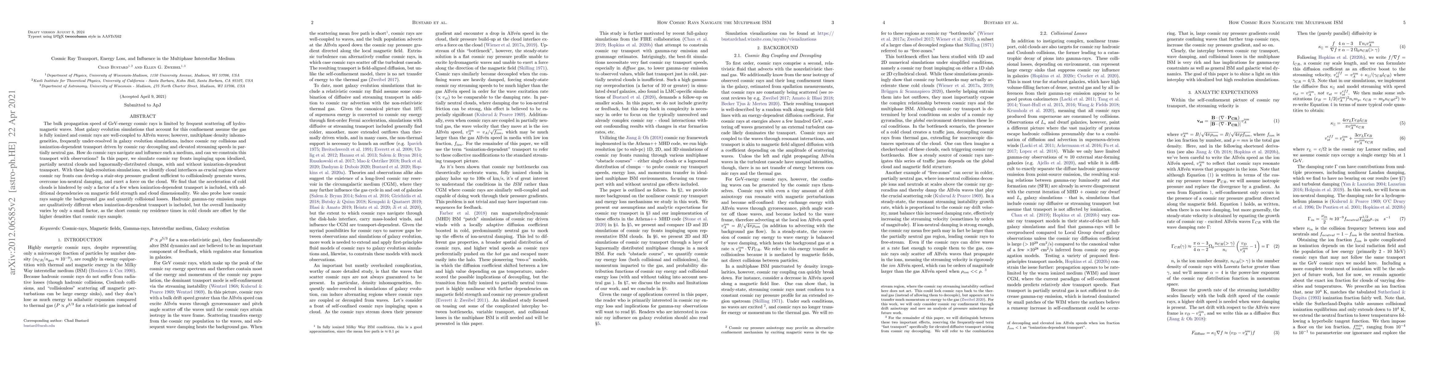 This paper investigates cosmic ray transport and energy loss in a multiphase interstellar medium, focusing on partially neutral gas. Simulations reveal that cosmic ray fronts can generate waves at cloud interfaces, influencing cloud dynamics despite ionization-dependent transport. The study finds that the overall gamma-ray luminosity changes little, as high densities compensate for short cosmic ray residence times.