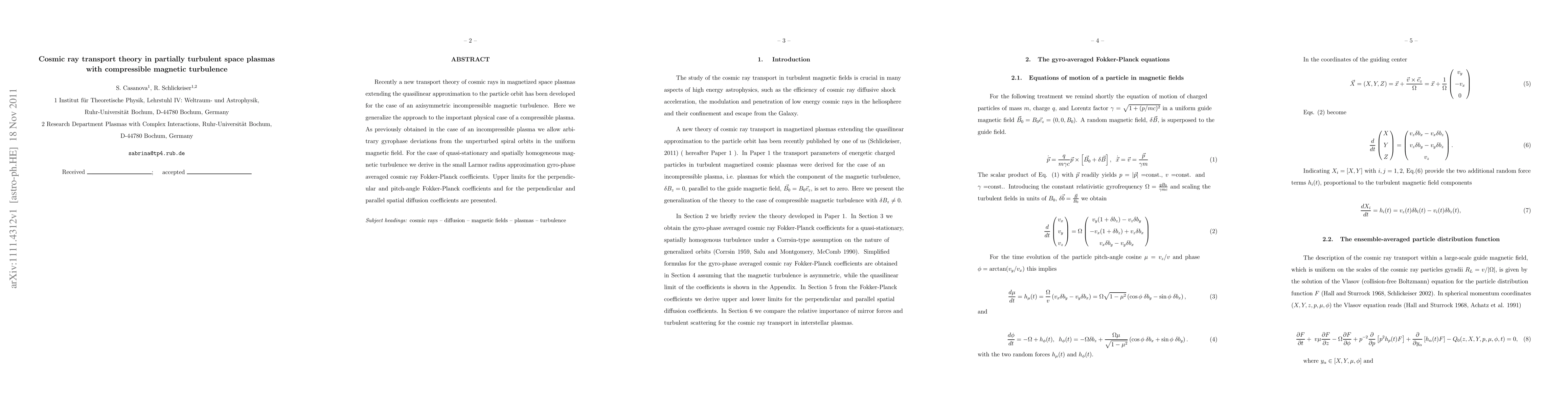 Recently a new transport theory of cosmic rays in magnetized space plasmas extending the quasilinear approximation to the particle orbit has been developed for the case of an axisymmetric incompressible magnetic turbulence. Here we generalize the approach to the important physical case of a compressible plasma. As previously obtained in the case of an incompressible plasma we allow arbitrary gyrophase deviations from the unperturbed spiral orbits in the uniform magnetic field. For the case of quasi-stationary and spatially homogeneous magnetic turbulence we derive in the small Larmor radius approximation gyro-phase averaged cosmic ray Fokker-Planck coefficients. Upper limits for the perpendicular and pitch-angle Fokker-Planck coefficients and for the perpendicular and parallel spatial diffusion coefficients are presented.