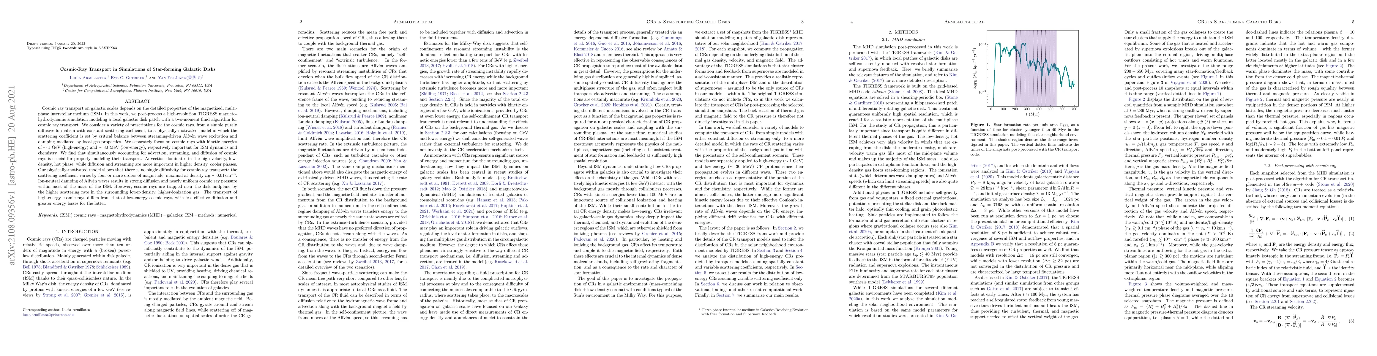 This research post-processes high-resolution magnetohydrodynamic simulations to model cosmic ray transport in star-forming galactic disks, showing that both advection and diffusion are critical. A physically-motivated model reveals that cosmic ray scattering varies significantly with density, leading to trapped high-energy cosmic rays near the disk midplane due to higher scattering rates in lower-density regions.