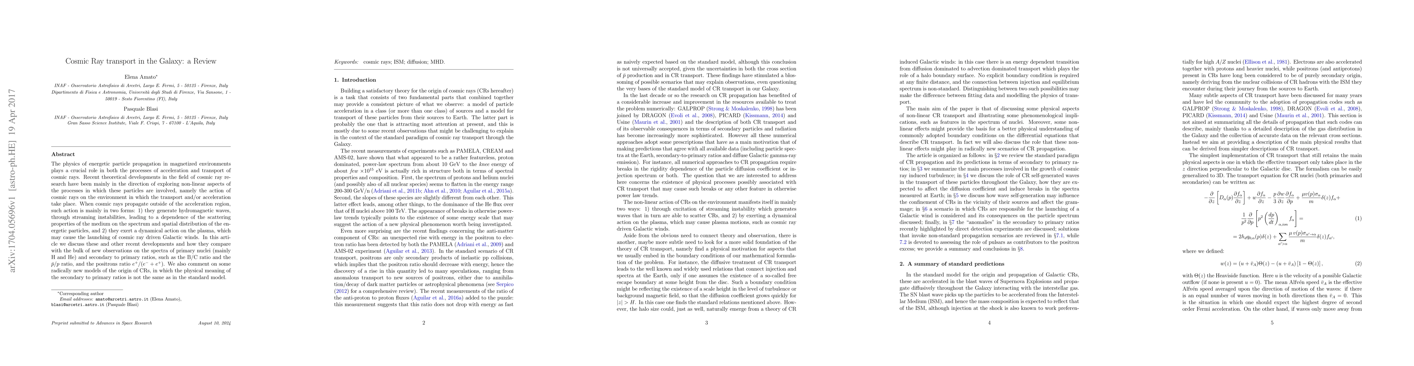 The physics of energetic particle propagation in magnetised environments plays a crucial role in both the processes of acceleration and transport of cosmic rays. Recent theoretical developments in the field of cosmic ray research have been mainly in the direction of exploring non-linear aspects of the processes in which these particles are involved, namely the action of cosmic rays on the environment in which the transport and/or acceleration take place. When cosmic rays propagate outside of the acceleration region, such action is mainly in two forms: 1) they generate hydromagnetic waves, through streaming instabilities, leading to a dependence of the scattering properties of the medium on the spectrum and spatial distribution of the energetic particles, and 2) they exert a dynamical action on the plasma, which may cause the launching of cosmic ray driven Galactic winds. In this article we discuss these and other recent developments and how they compare with the bulk of new observations on the spectra of primary nuclei (mainly H and He) and secondary to primary ratios, such as the B/C ratio and the $\bar p$/ratio, and the positrons ratio $e^+/(e^-+e^+)$. We also comment on some radically new models of the origin of CRs, in which the physical meaning of the secondary to primary ratios is not the same as in the standard model.