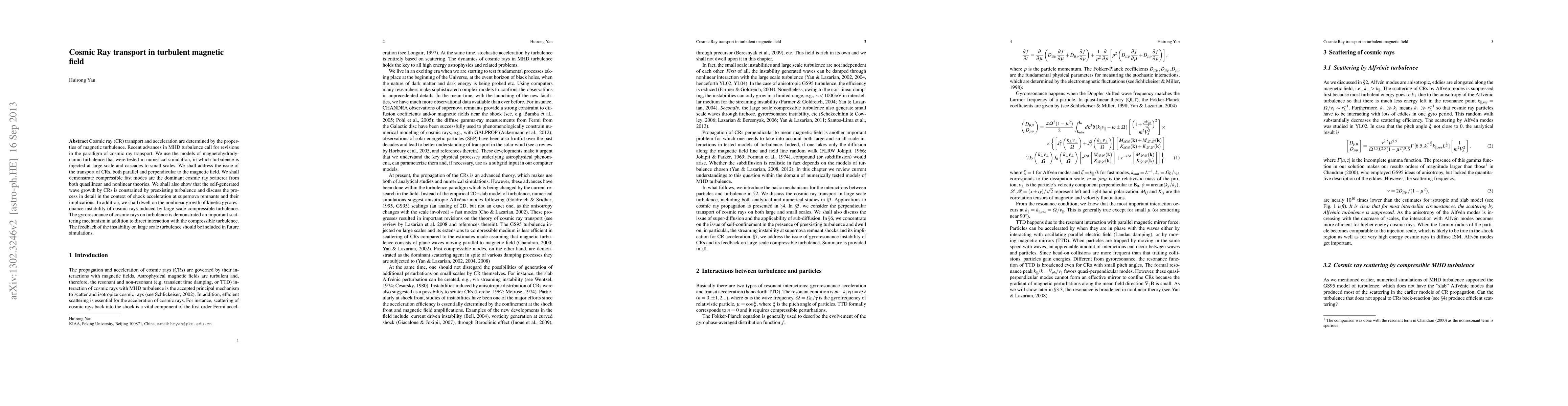 This paper examines cosmic ray transport in turbulent magnetic fields, emphasizing the role of magnetohydrodynamic turbulence. It highlights that compressible fast modes are the primary cosmic ray scatterers and discusses the nonlinear growth of kinetic gyroresonance instability, suggesting it as an important scattering mechanism alongside direct turbulence interactions.