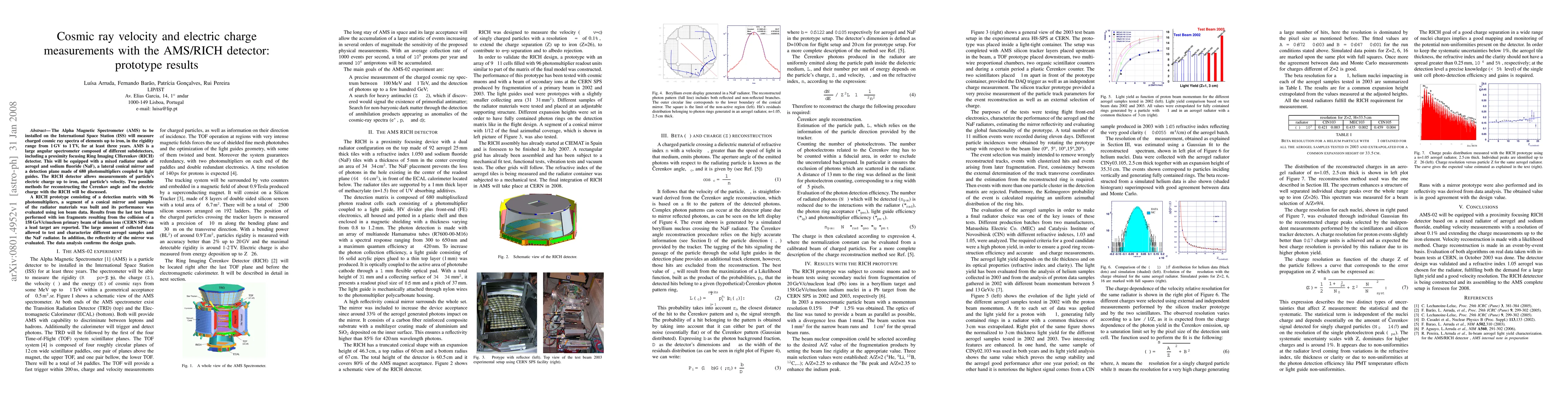 The Alpha Magnetic Spectrometer (AMS) to be installed on the International Space Station (ISS) will measure charged cosmic ray spectra of elements up to iron, in the rigidity range from 1 GV to 1 TV, for at least three years. AMS is a large angular spectrometer composed of different subdetectors, including a proximity focusing Ring Imaging CHerenkov (RICH) detector. This will be equipped with a mixed radiator made of aerogel and sodium fluoride (NaF), a lateral conical mirror and a detection plane made of 680 photomultipliers coupled to light guides. The RICH detector allows measurements of particle's electric charge up to iron, and particle's velocity. Two possible methods for reconstructing the Cherenkov angle and the electric charge with the RICH will be discussed. A RICH prototype consisting of a detection matrix with 96 photomultipliers, a segment of a conical mirror and samples of the radiator materials was built and its performance was evaluated using ion beam data. Results from the last test beam performed with ion fragments resulting from the collision of a 158 GeV/c/nucleon primary beam of indium ions (CERN SPS) on a lead target are reported. The large amount of collected data allowed to test and characterize different aerogel samples and the NaF radiator. In addition, the reflectivity of the mirror was evaluated. The data analysis confirms the design goals.