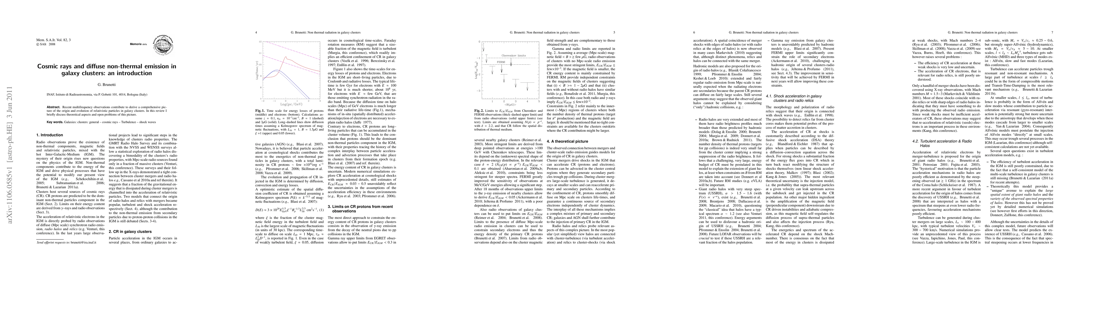 This review discusses the origin and evolution of relativistic particles in galaxy clusters through multifrequency observations, highlighting key findings on cosmic rays and diffuse non-thermal emission.