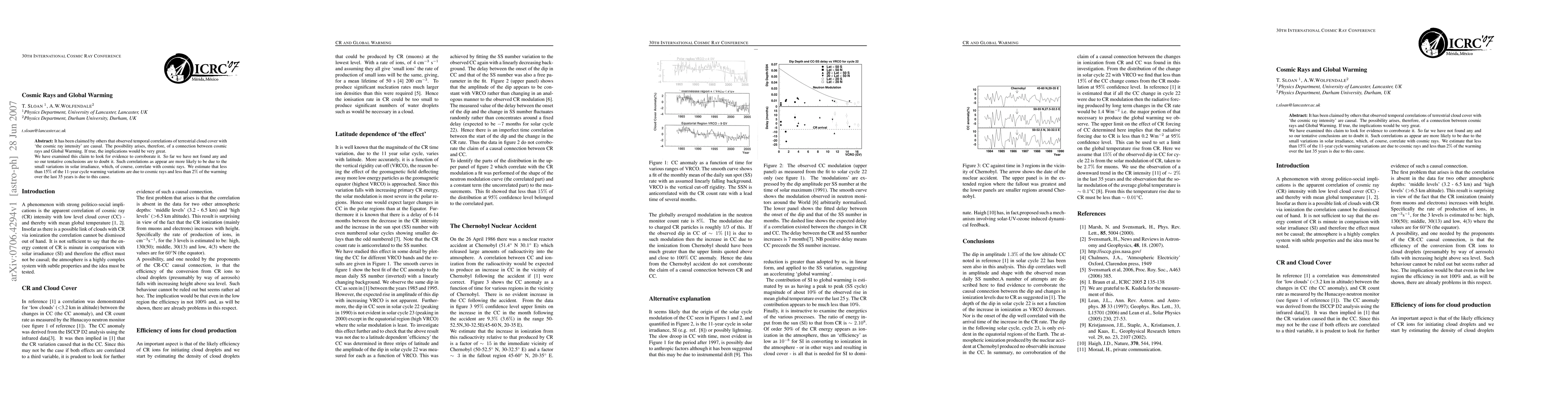 This research investigates the hypothesis linking cosmic rays to global warming, finding no substantial evidence to support a causal relationship. Instead, observed correlations are likely due to small variations in solar irradiance, with cosmic rays accounting for less than 15% of the 11-year cycle warming variations and less than 2% of the warming over the last 35 years.