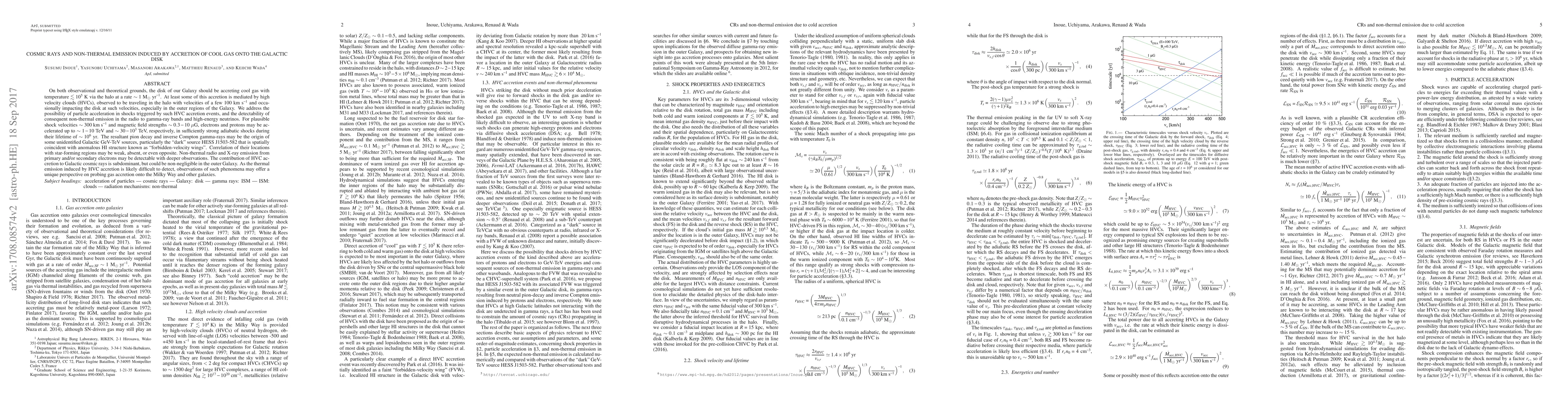 On both observational and theoretical grounds, the disk of our Galaxy should be accreting cool gas with temperature ~<10^5 K via the halo at a rate ~1 M_sun/yr. At least some of this accretion is mediated by high velocity clouds (HVCs), observed to be traveling in the halo with velocities of a few 100 km/s and occasionally impacting the disk at such velocities, especially in the outer regions of the Galaxy. We address the possibility of particle acceleration in shocks triggered by such HVC accretion events, and the detectability of consequent non-thermal emission in the radio to gamma-ray bands and high-energy neutrinos. For plausible shock velocities ~300 km/s and magnetic field strengths ~0.3-10 muG, electrons and protons may be accelerated up to ~1-10 TeV and ~30-10^3 TeV, respectively, in sufficiently strong adiabatic shocks during their lifetime of ~10^6 yr. The resultant pion decay and inverse Compton gamma-rays may be the origin of some unidentified Galactic GeV-TeV sources, particularly the "dark" source HESS J1503-582 that is spatially coincident with anomalous HI structure known as "forbidden-velocity wings". Correlation of their locations with star-forming regions may be weak, absent or even opposite. Non-thermal radio and X-ray emission from primary and/or secondary electrons may be detectable with deeper observations. The contribution of HVC accretion to Galactic cosmic rays is subdominant, but could be non-negligible in the outer Galaxy. As the thermal emission induced by HVC accretion is likely difficult to detect, observations of such phenomena may offer a unique perspective on probing gas accretion onto the Milky Way and other galaxies.